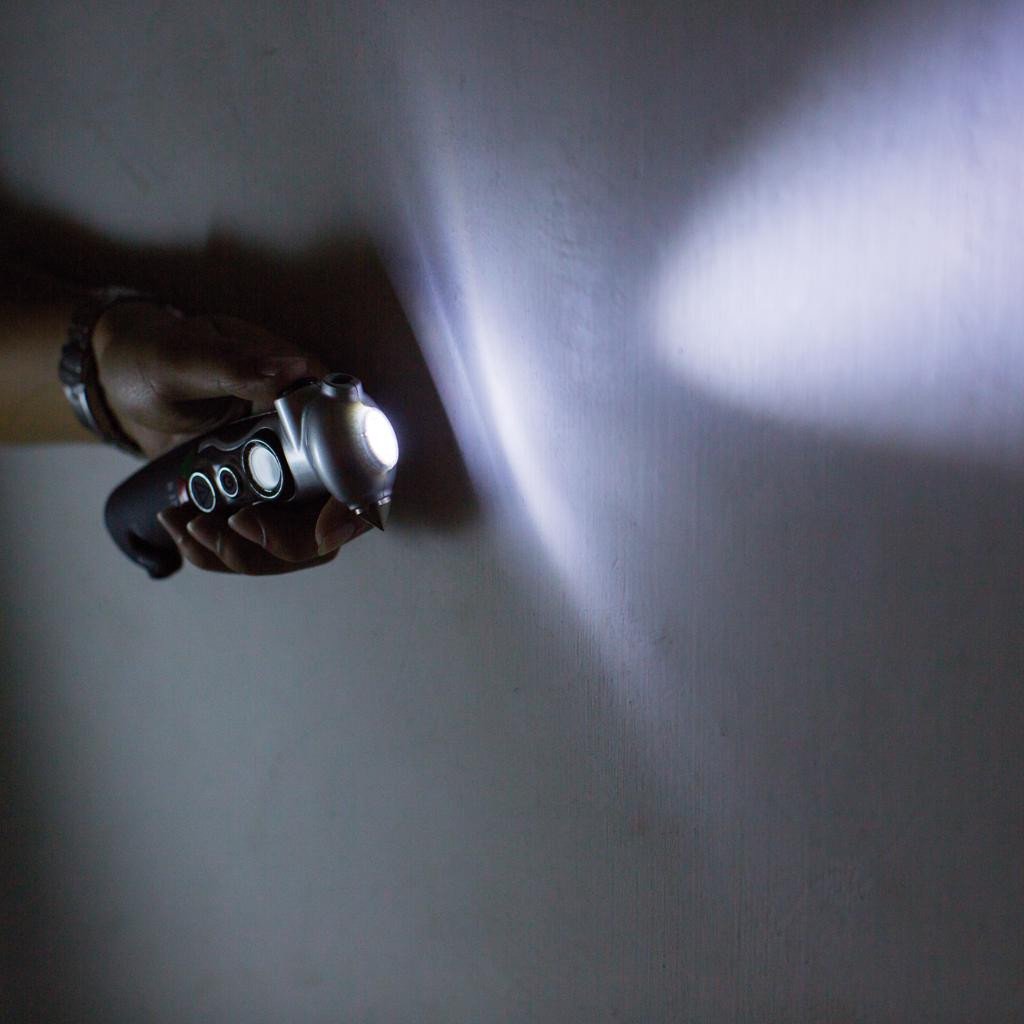 Jauge à pneus multifonctionnelle dans un boîtier en ABS avec toutes les fonctions de sécurité nécessaires. Vous pourrez vérifier vos pneus et même les dégonfler, couper votre ceinture de sécurité, briser votre vitre et éclairer l'environnement.