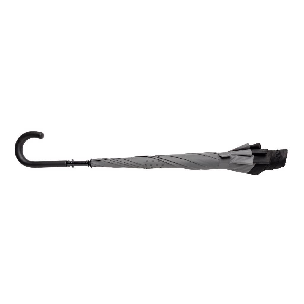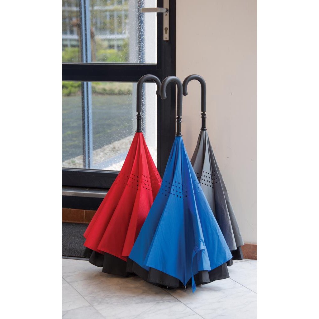 Parapluie réversible de 23'' en tissu pongé 190T avec ouverture et fermeture manuelle. Structure résistant au vent grâce à son armature et baleines en fibre de verre.