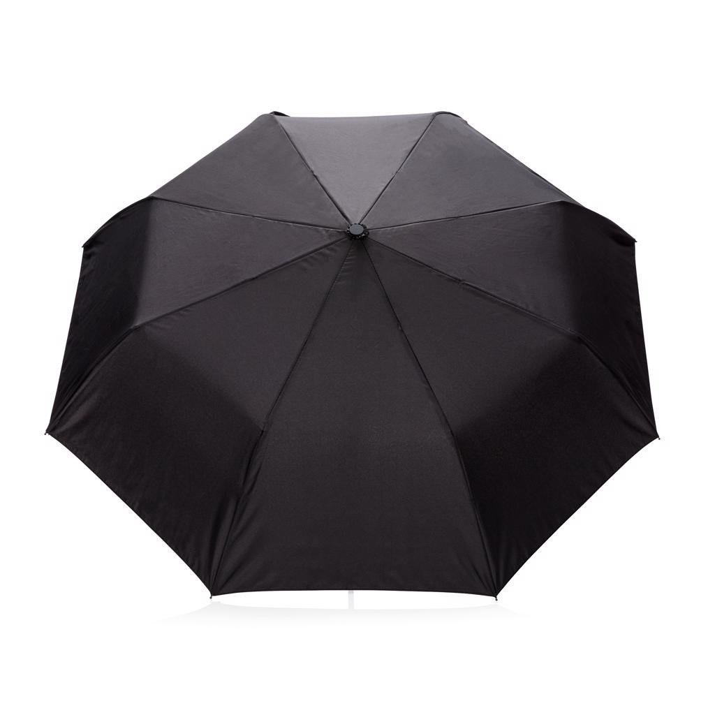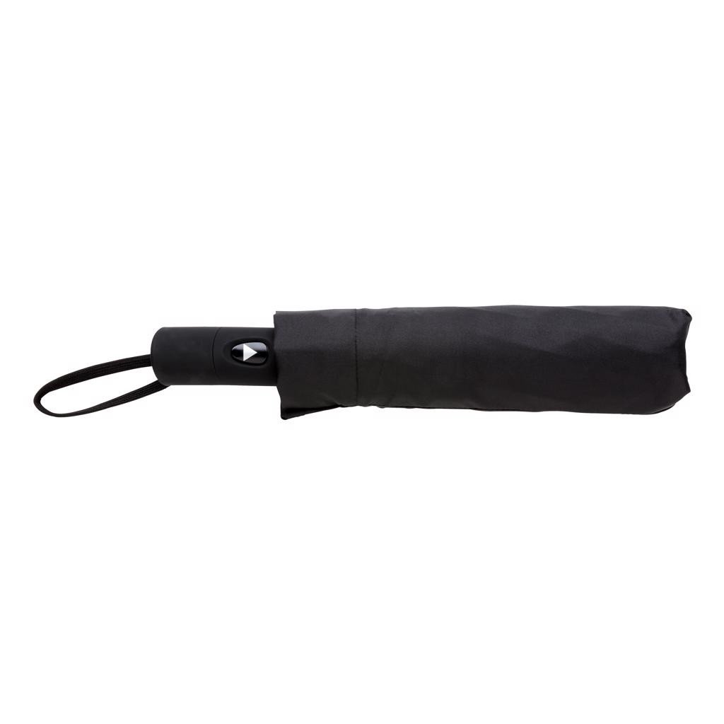 Parapluie pliable 21'' en polyester pongé 190T avec ouverture automatique. Armature en métal laquée noir, baleines en fibre de verre, poignée et pochette assorties.