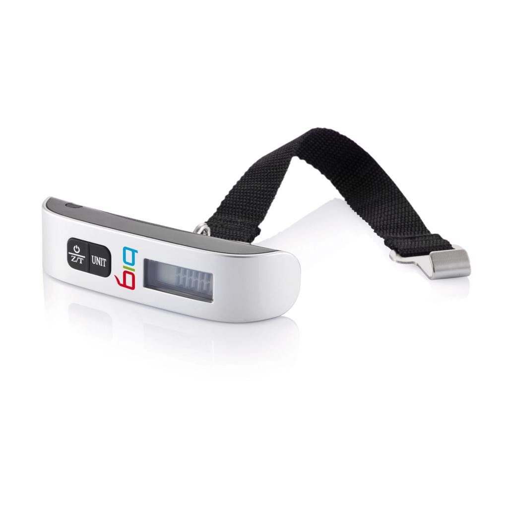 Pèse-bagage électronique, capacité max. de 50kg, indication par 50g, fonction tare et zéro; affichage de surcharge et de piles faibles, avec affichage de la température ambiante.