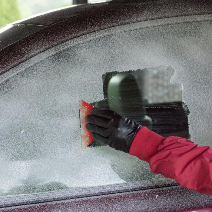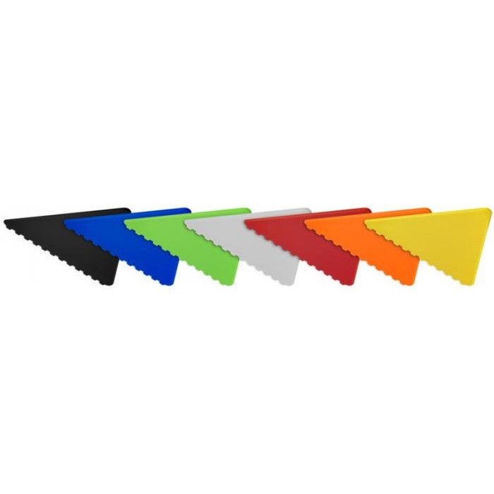 Grattoir triangulaire pour enlever la glace et la neige sur les pare-brise avec une grande surface décorative. Chacun des trois côtés peut être utilisé pour gratter la glace. Fabriqué au Royaume-Uni à partir de plastique recyclé.