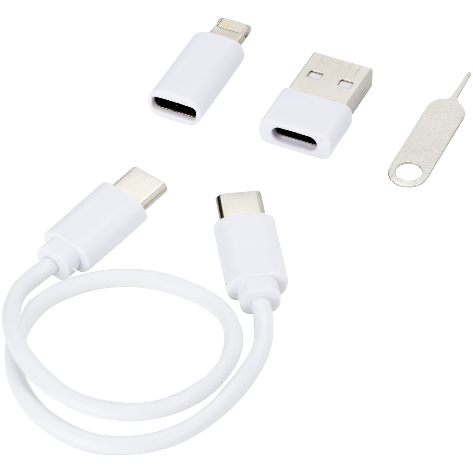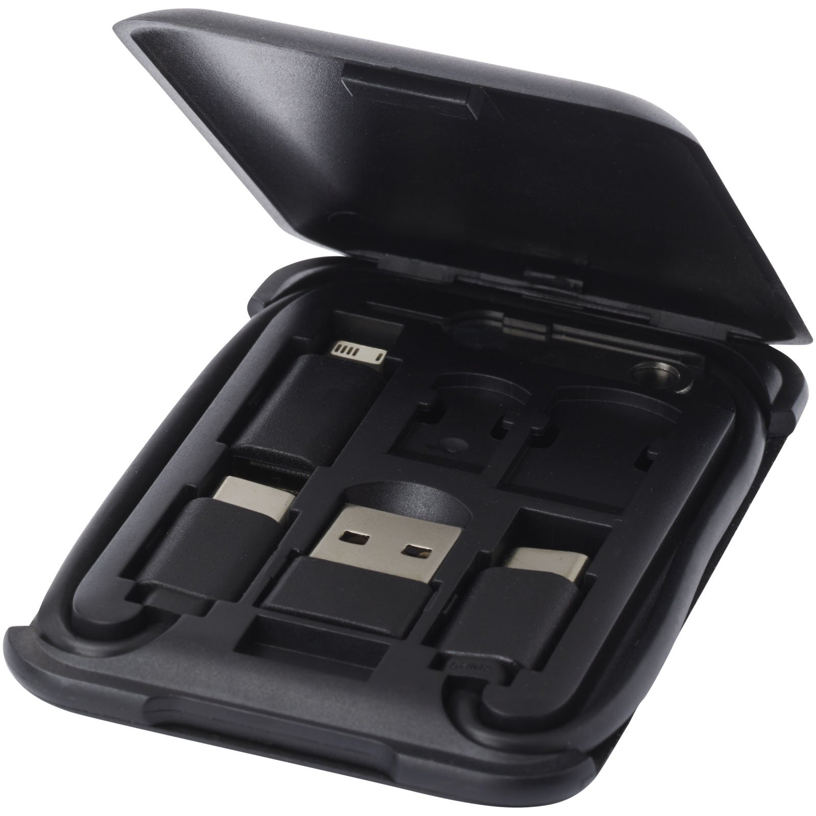 Câble modulaire de transfert de données et de recharge en plastique recyclé, livré dans une élégante boîte de rangement qui sert également de support de téléphone. Le câble offre de multiples solutions de recharge : Entrée type-C et USB-A, et sortie type-C/iOS/micro USB. Grâce à tous ces adaptateurs et connecteurs, ce câble vous permet de charger la plupart des smartphones, appareils photo, batteries de secours, écouteurs, etc. Le câble a une puissance de sortie maximale de 2 A. Comprend une broche d'éjection qui s'avère très pratique lorsque vous devez retirer la carte SIM de votre téléphone. La boîte de rangement peut également contenir une carte mémoire micro SD ainsi qu'une carte nano SIM, ce qui en fait l'accessoire de voyage idéal. Longueur du câble : 26 cm. Livré dans une enveloppe en papier Kraft 100 % recyclé.