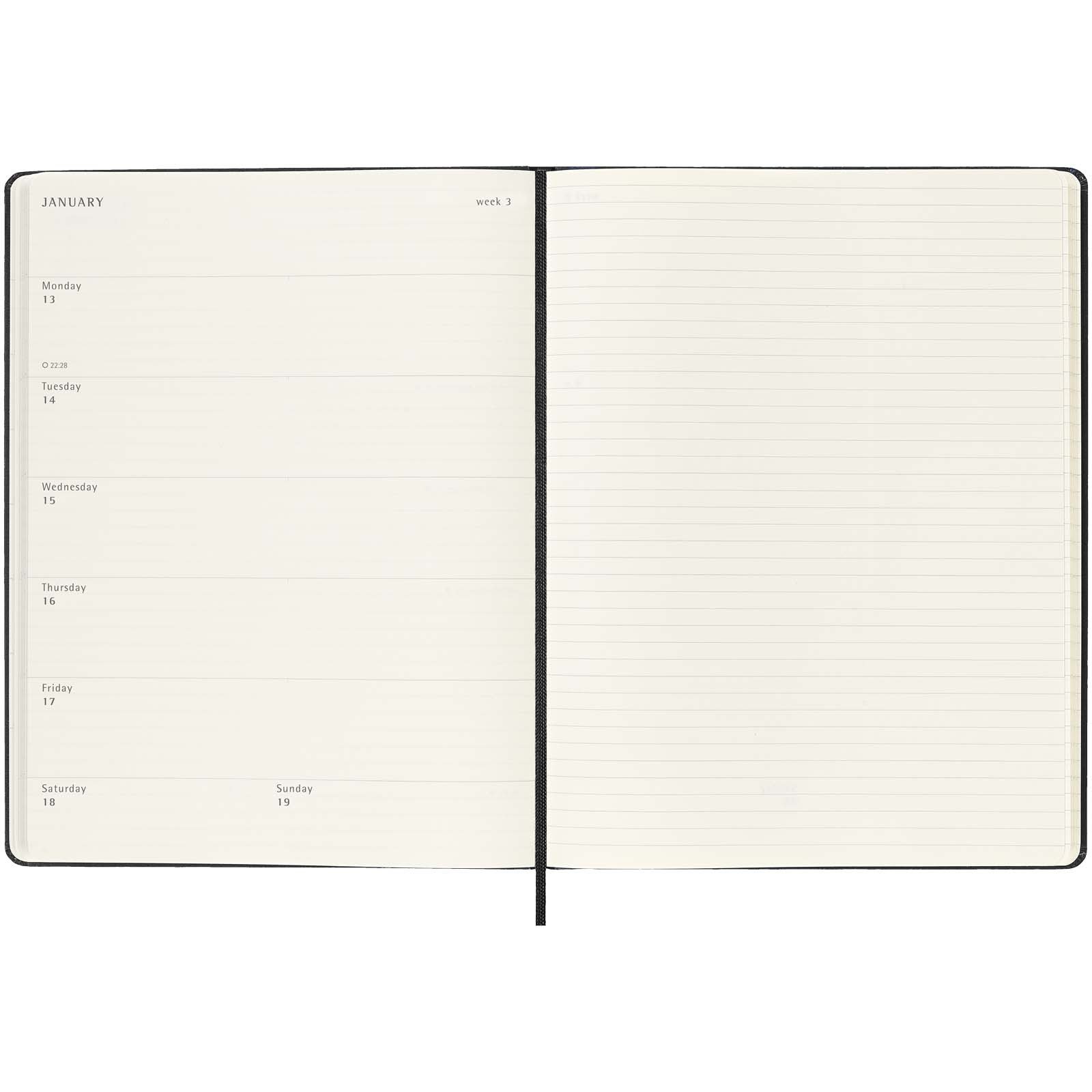 Daté de janvier à décembre 2025. L'agenda hebdomadaire Moleskine de 12 mois au format XL (25 cm x 19 cm) à couverture rigide permet de visualiser la semaine entière en un coup d’œil. Il offre également des pages d’instantanés annuels et mensuels pour une vue d’ensemble de l’année, suivies de pages pour la planification des voyages, les idées et les objectifs. Les jours de la semaine sont affichés sur un côté, en regard d’une page lignée pour les tâches et les notes. Il est doté d’un papier ivoire sans acide et d’un élastique de fermeture noir. Il comprend également un marque-page et une pochette intérieure extensible de couleur assortie. Des autocollants pour la personnalisation, ainsi que des autocollants de l’année pour le dos, viennent compléter l'ensemble.