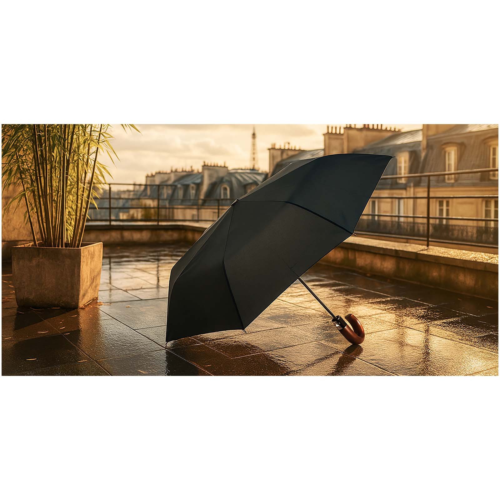 Le parapluie pliant Pepin en polyester 100 % recyclé est à la fois pratique et durable, avec un système d’ouverture automatique pour une utilisation sans effort. Sa structure en fibre de verre, son mât en métal et ses baleines renforcées garantissent une solidité à long terme, tandis que la poignée incurvée en bois foncé apporte une touche raffinée et élégante. Fourni avec une housse assortie. Dimensions : Ø95 × H63 cm. Fabriqué en Europe.