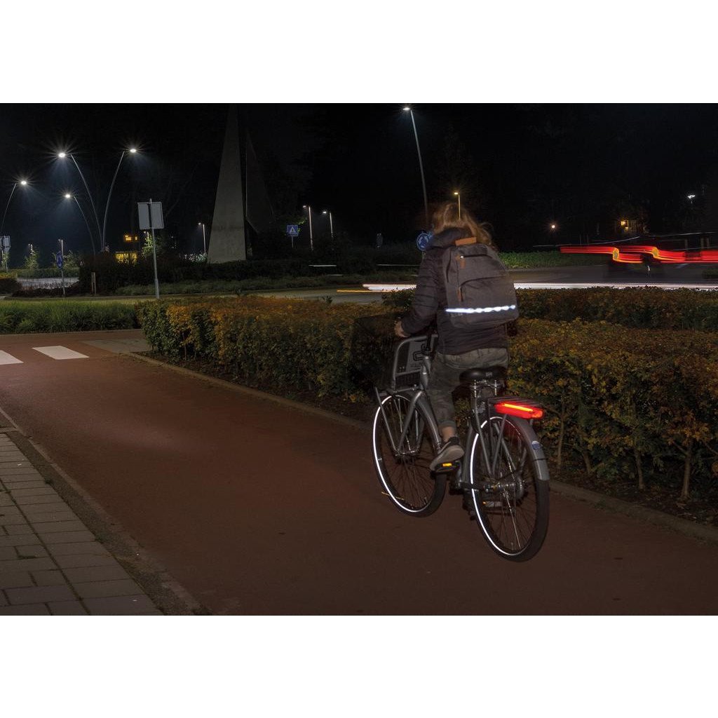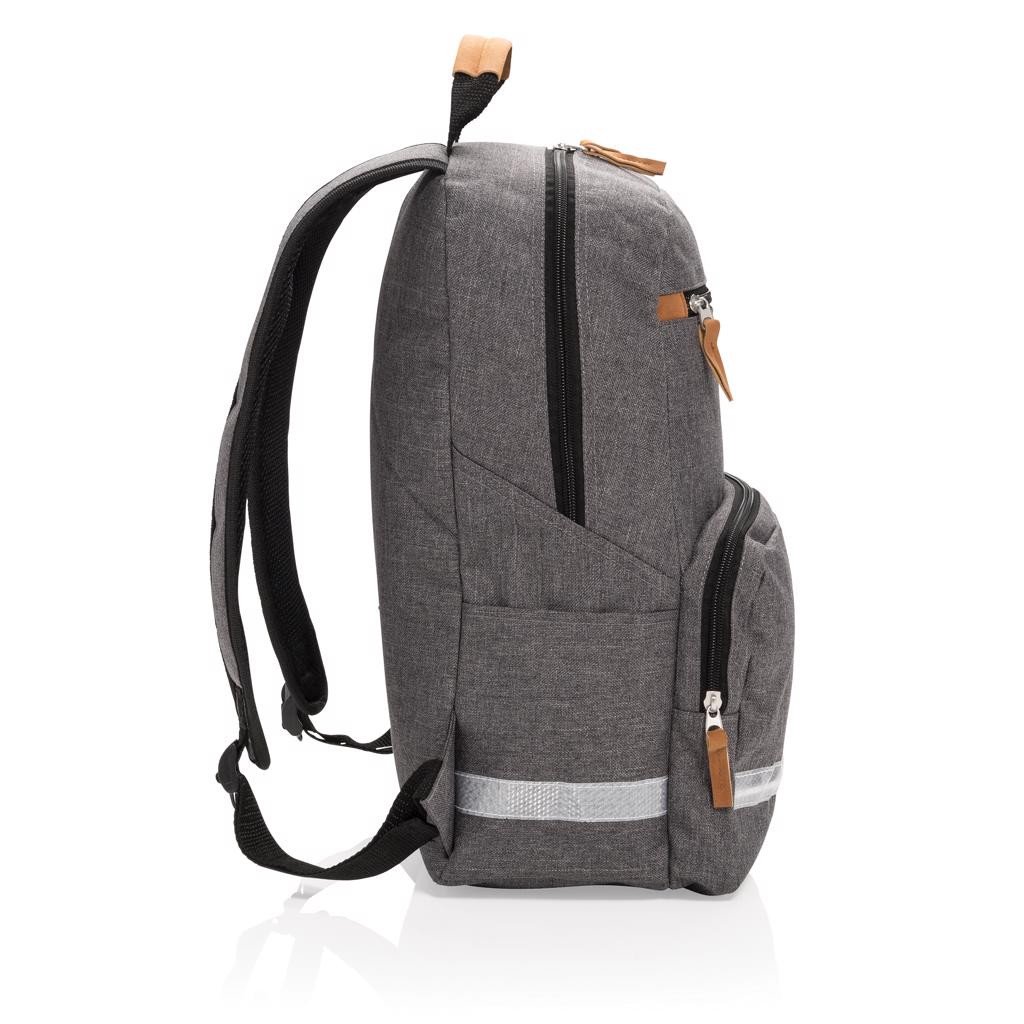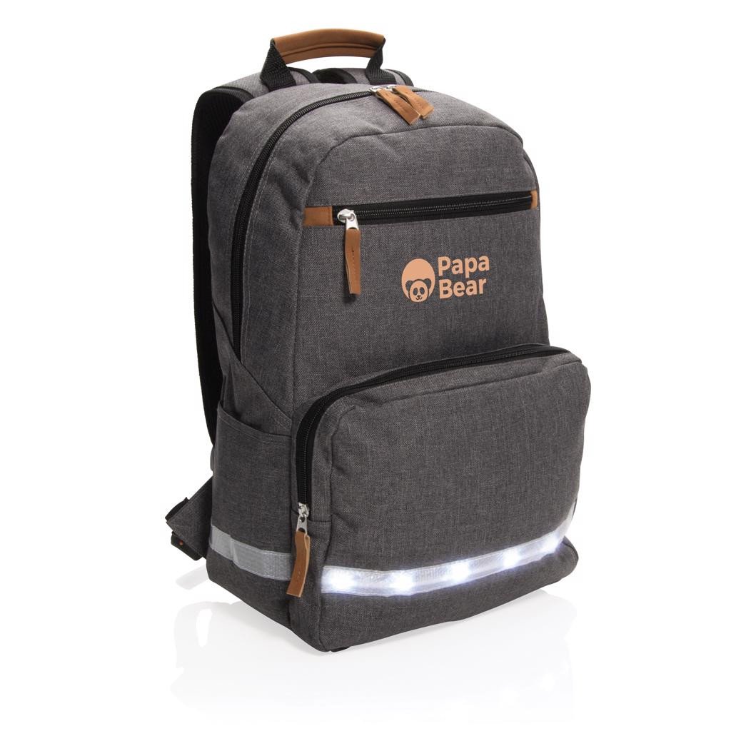 Sac à dos en polyester 600D double ton et détails marron. Grand compartiment pour ordinateur jusqu'à 13 pouces, 2 poches frontales et 2 latérales. La bande LED a 3 fonctions, télécommande dans la poche frontale. Piles bouton CR 2032 incluses.