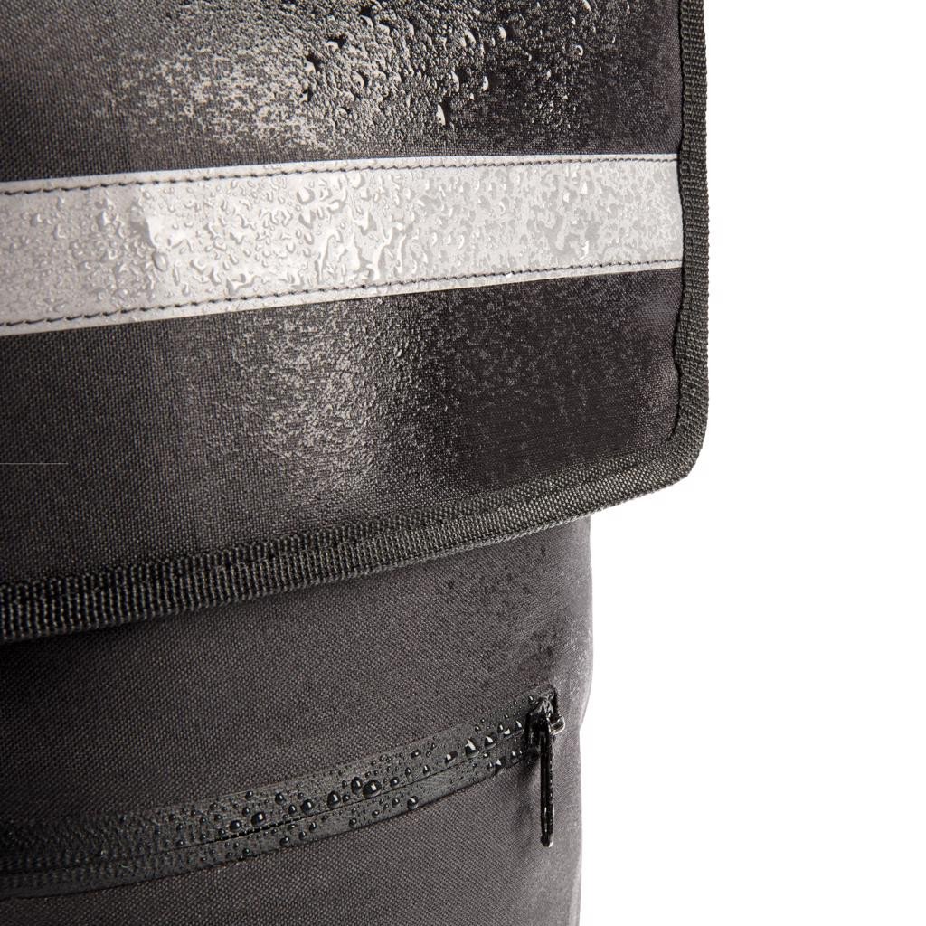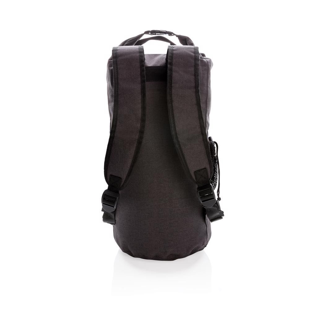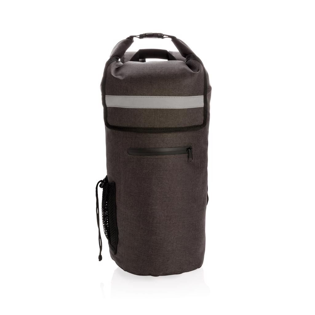 Sac à dos 300D en polyester avec compartiment principal étanche IPX6, idéal pour voyager et saura protéger vos effets personnels. Avec poche latérale pour une bouteille d'eau et bande de sécurité réfléchissante. La poche frontale zippée n'est pas étanche.