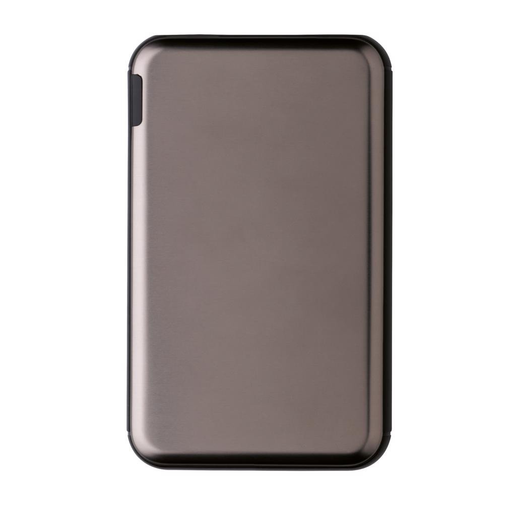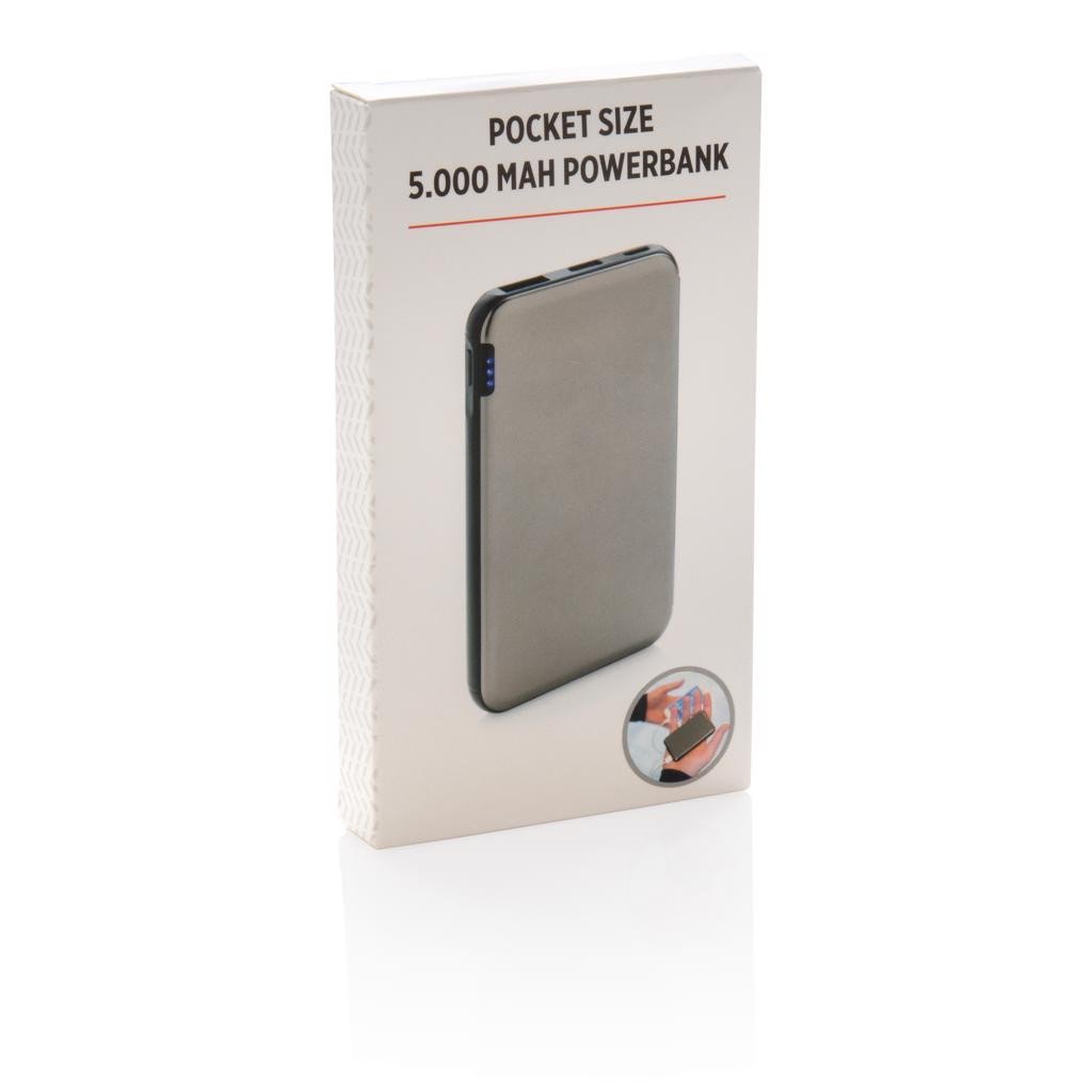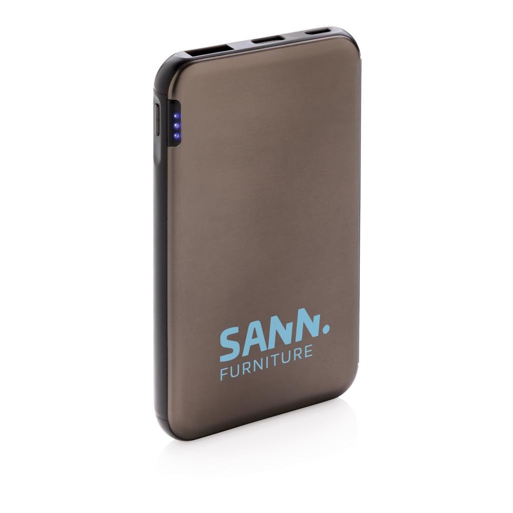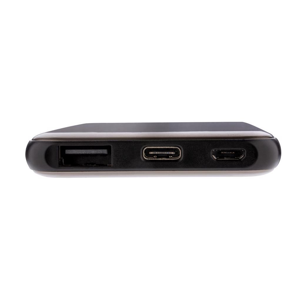 Powerbank 5000 mAh ultraplate en alliage d'aluminium. Lorsqu'il est complètement chargé, il vous fournira assez d'énergie pour recharger votre téléphone mobile jusqu'à 2 fois. Les indicateurs de puissance indiquent le niveau d'énergie restant pour que vous sachiez toujours quand recharger. Micro port USB : 5V/2A ; entrée Type C : 5V/2A ; Sortie : USB 5V/2.1A.