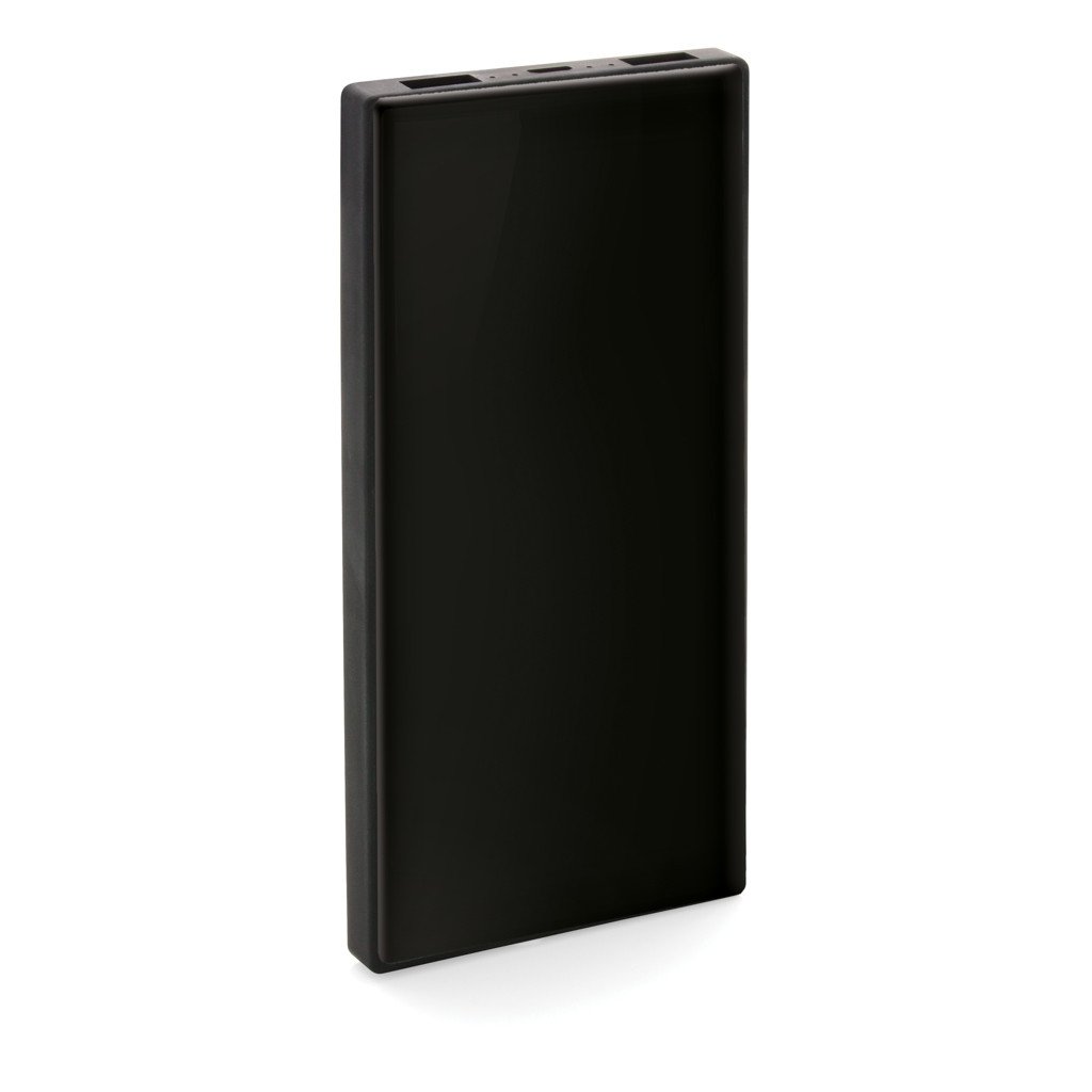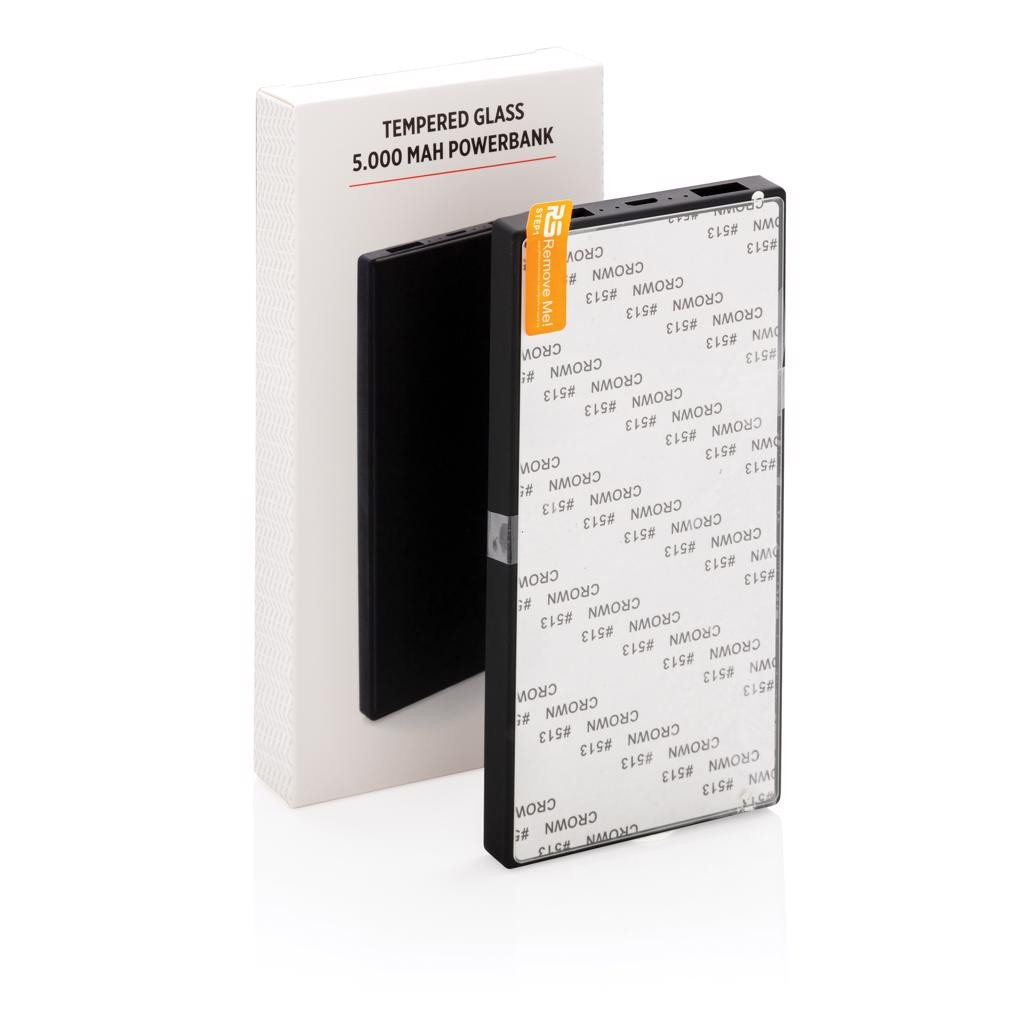 Batterie de secours 5000 mAh en ABS. Espace au dos de la batterie pour un marquage quadri recouvert d'un verre trempé pour un effet optimal. La powerbank a une double sortie USB pour charger 2 téléphones en même temps. Avec indicateurs de puissance indiquant le niveau d'énergie restant. Entrée Micro USB 5V/2A, 2x Sortie USB 5V/2A. Câble micro USB en TPE inclus.