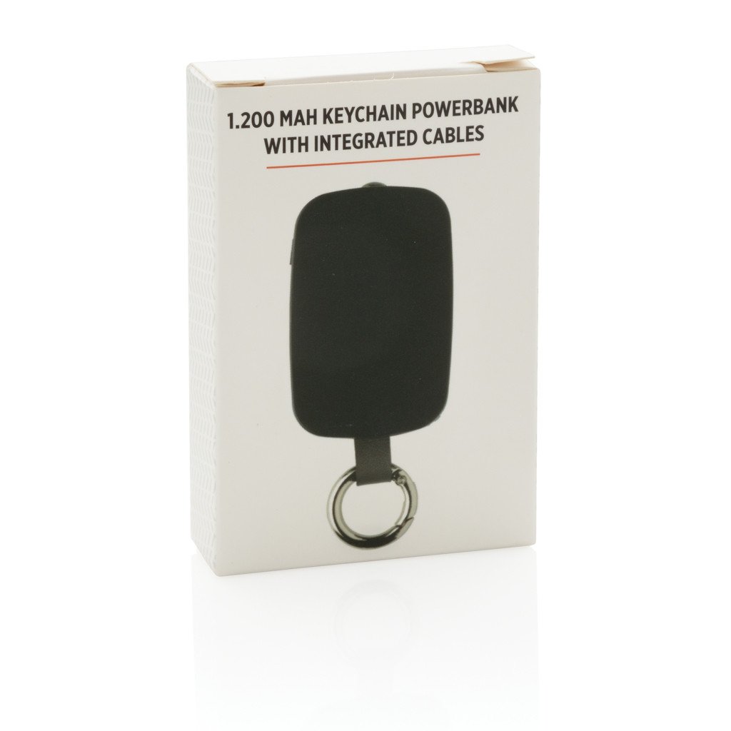 Batterie de secours 1200mAh en ABS avec porte-clés et câble 3 en 1 (IOS, Micro, type C) en TPE. Lampe torche avec fonction stroboscope incluse. Entrée 5V/1A. Sortie 5V/1A.