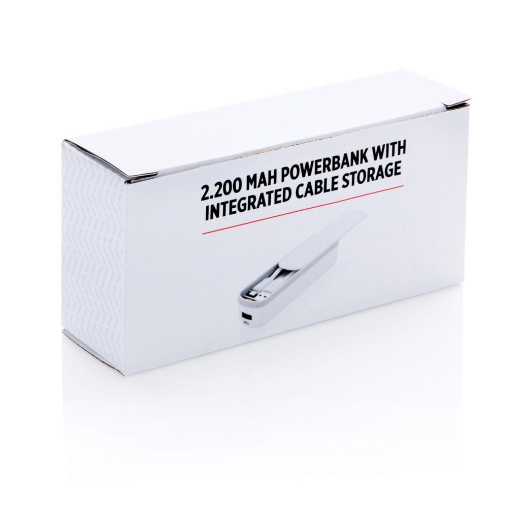 Powerbank 2200mAh avec compartiment spécial pour stocker votre câble micro USB et ne jamais l'oublier. Sortie 5V/1A, entrée 5V/1A, câble micro USB inclus.