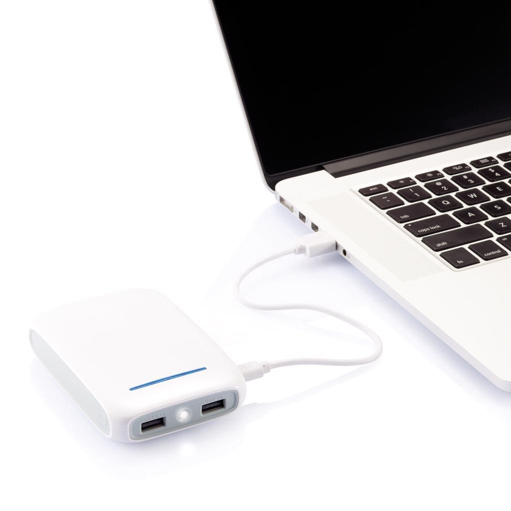 Powerbank en ABS de 10000 mAh. Avec sortie 5V/2,1A et 5V/1A, et entrée 5V/1,5A.