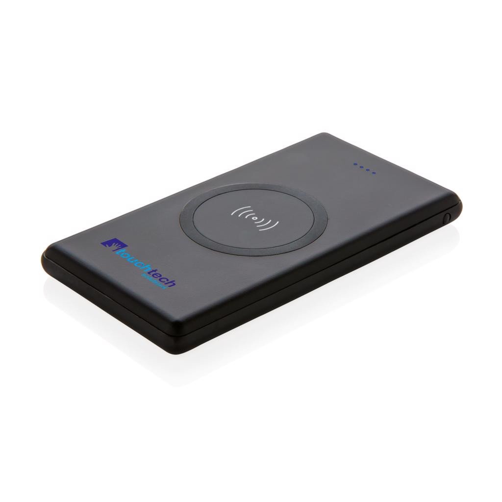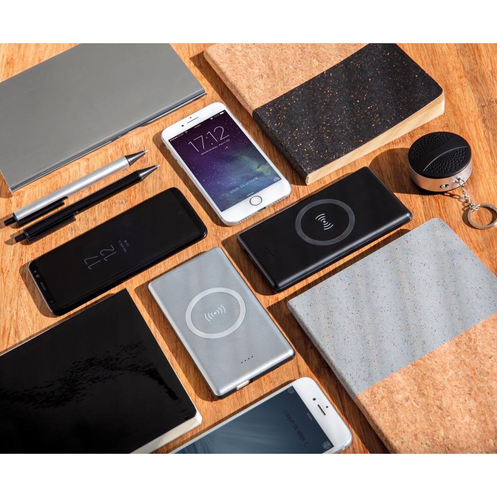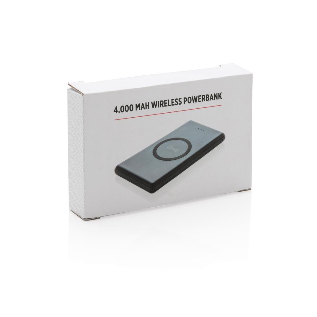 Powerbank 4000 mAh en ABS avec un chargeur à induction 5 W et témoins indicateurs de capacité. Compatible avec tous les appareils supportant la recharge sans fil (Qi) comme Android dernière génération, iPhone 8 et plus. Sortie : 5V/2,1A. Entrée : 5V/1,5A. Sortie induction : 5 V/1 A, 5 W. Câble micro USB inclus.