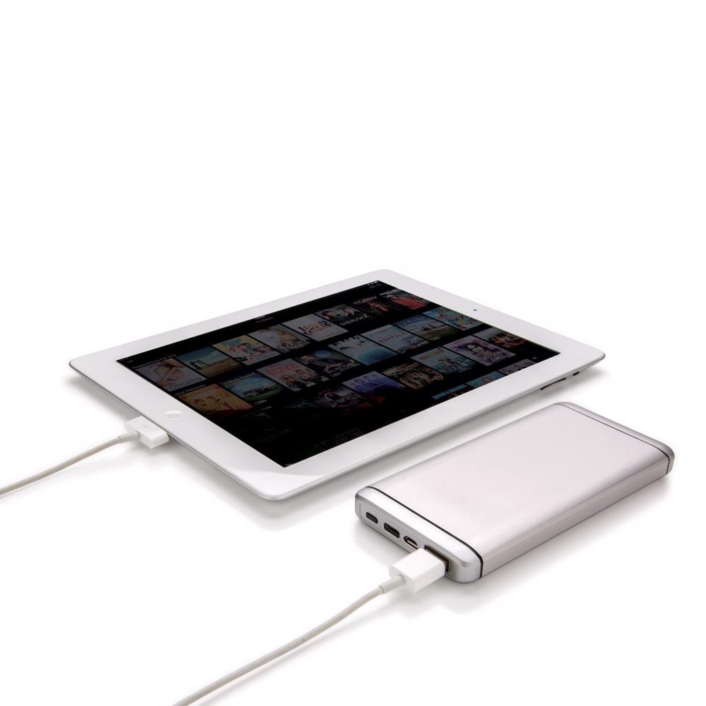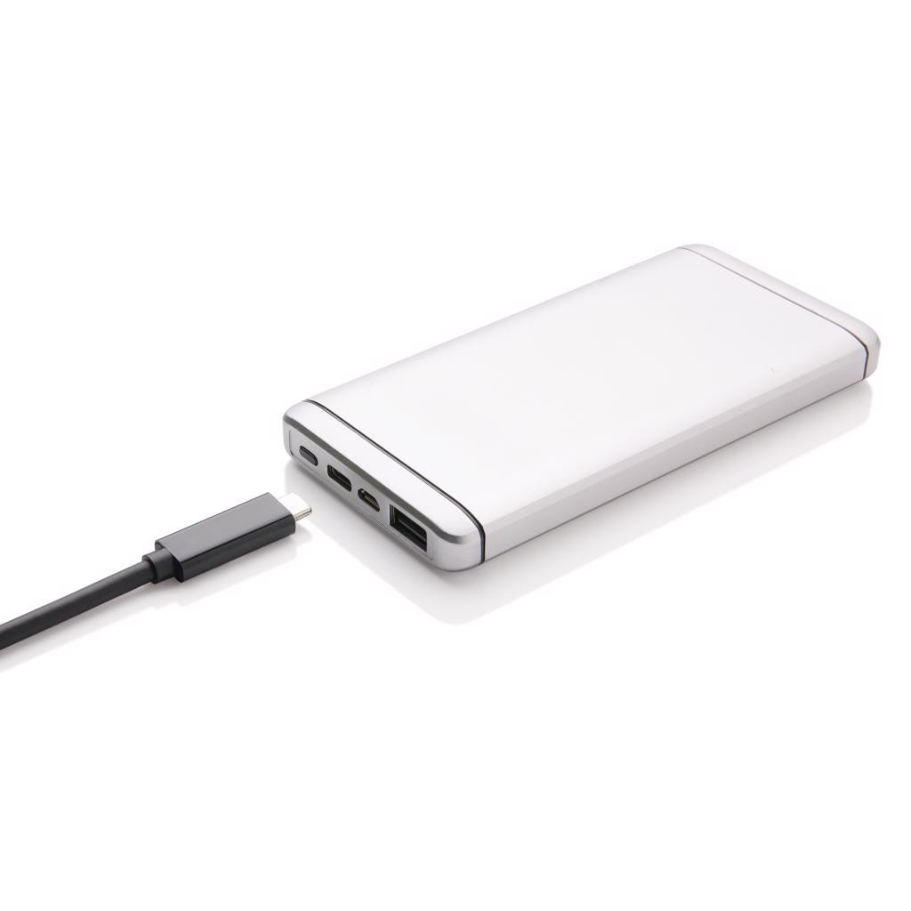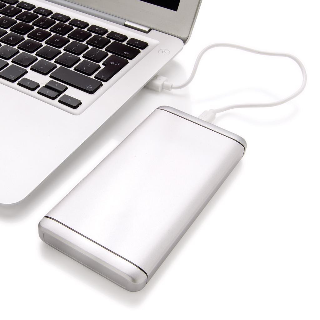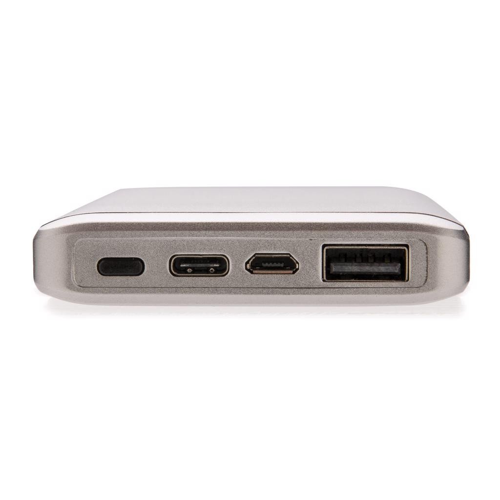 Powerbank 10000 mAh en aluminium anodisé. Cette batterie possède une sortie USB et une sortie de type C. Type C est la nouvelle norme standard pour les appareils mobiles ainsi ce dispositif pour permet d'utiliser n'importe quel câble disponible. Sortie 5V/ 2A et entrée 1A.