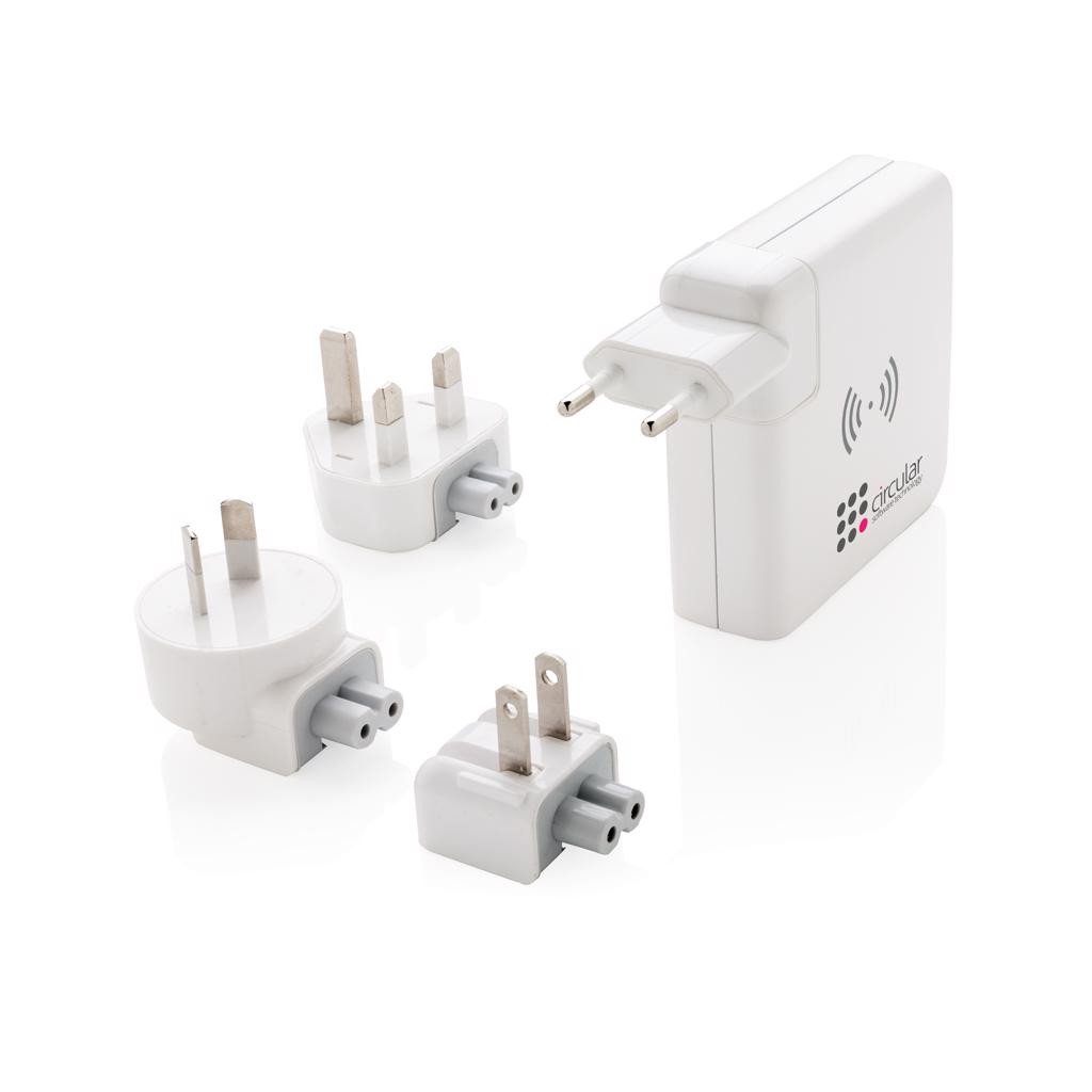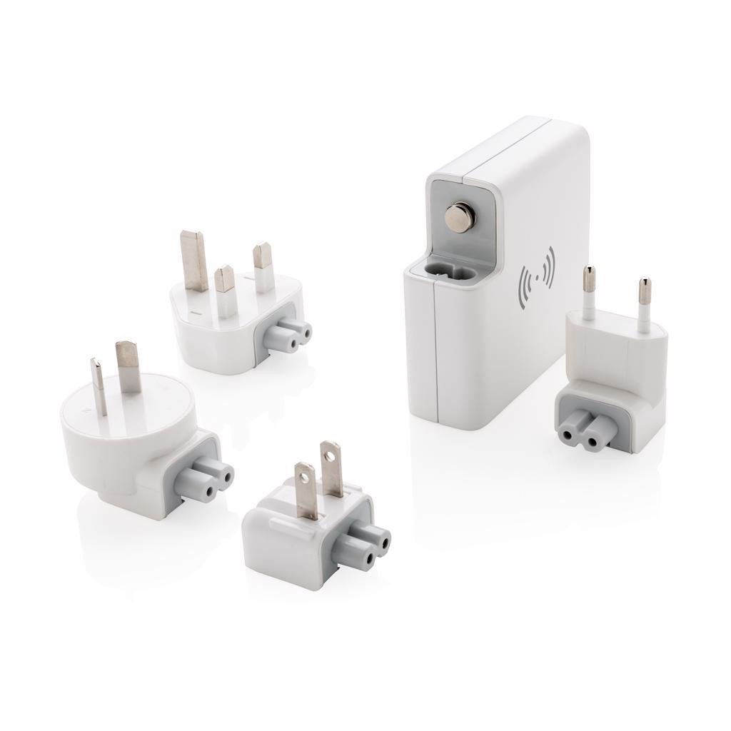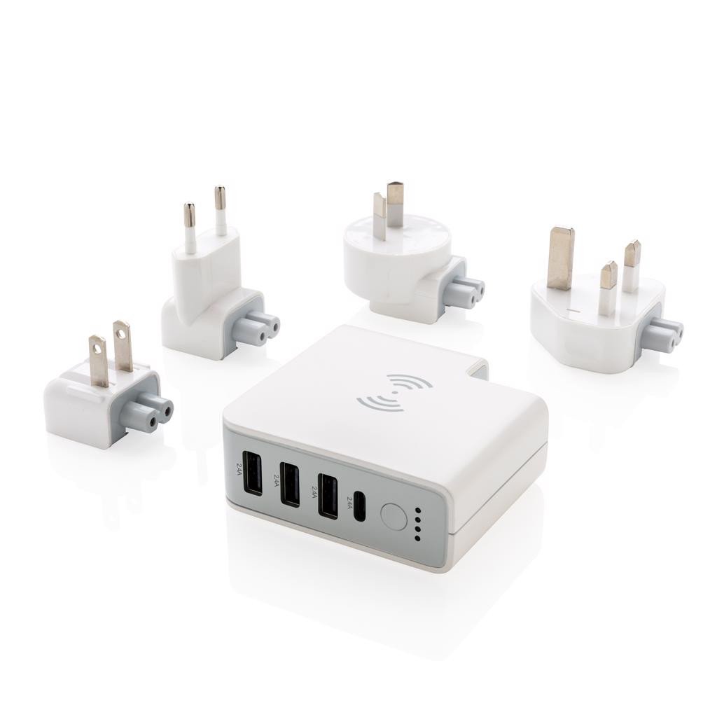Powerbank 6700 mAh avec un adaptateur de voyage au design unique qui permet de charger vos appareils n'importe o๠dans le monde. Branchez simplement la fiche incluse à la prise murale de votre lieu de destination ou chez vous. Cet adaptateur est unique parce qu'il peut être utilisé à la maison pour charger vos appareils mobiles mais vous pouvez aussi l'emporter avec vous comme une batterie de secours. L'adaptateur de voyage possède 3 ports USB et un port type C, pour une sortie totale de 4.2 A. Sortie via induction : 5 V/1 A, 5 W. Le chargeur est fourni avec 4 fiches, EU, UK, USA et Australie, et une pochette microfibres pour les emporter avec vous dans vos voyages. Entrée : 100-240 V CA, 50/60 Hz, sortie : 5 V/4.2 A.
