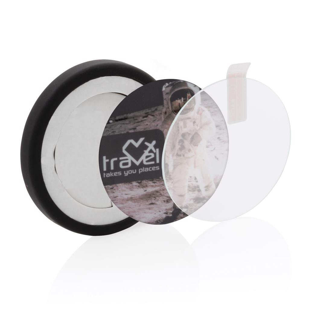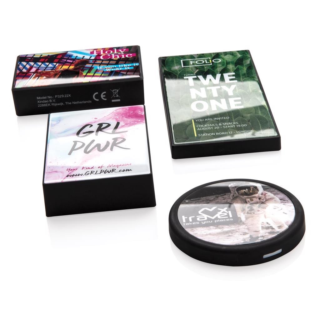 Chargeur à induction 5W en ABS. Espace au dos de la batterie pour un marquage quadri recouvert d'un verre trempé pour un effet optimal. Chargement sans fil compatible avec tous les appareils supportant la recharge à induction (Qi) comme Android dernière génération, iPhone 8 et plus. Entrée Micro USB 5V/1A, Sortie induction : 5W 5V/1A. Câble micro USB de 120cm en TPE inclus.