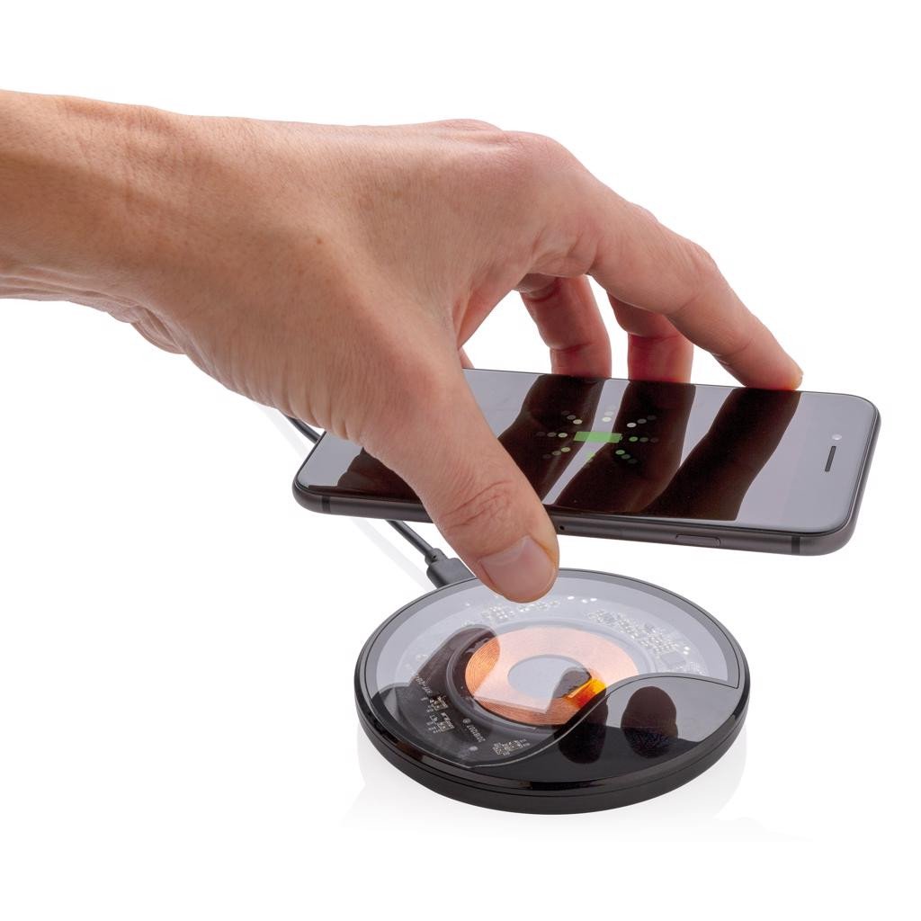 Chargeur à induction 10W au design transparent pour exposer les composants de qualité A+, la bobine de charge et la lumière de charge LED bleu. Le socle de charge en ABS offre une charge rapide et sure de 10W pour charger votre téléphone deux fois plus vite que la plupart des chargeurs sans fil sur le marché. Chargeur sans fil compatible avec tous les Android dernière génération, iPhone 8 et plus. Entrée : 5 V/2 A, sortie induction : 9V/1.1 A, 10 W. Câble 150cm USB/Type C pour chargement rapide.