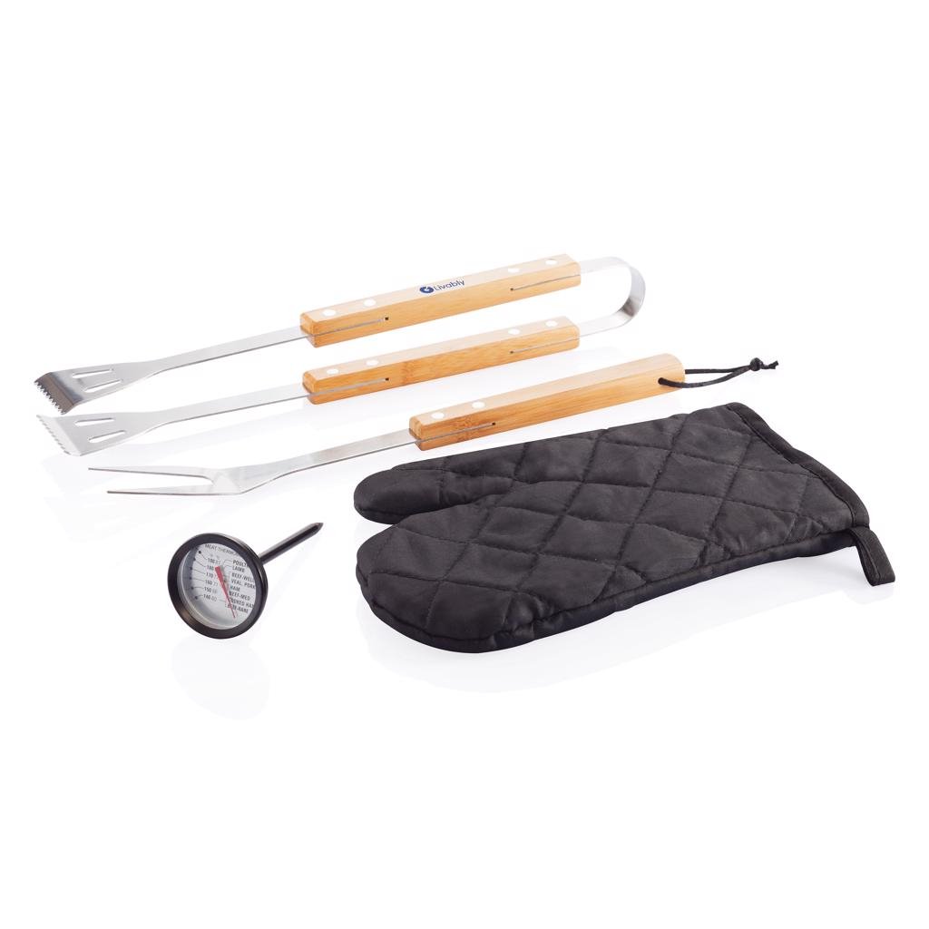 4-delige roestvrijstalen barbecue set inclusief spatel, tang, barbecue handschoen en vlees thermometer.