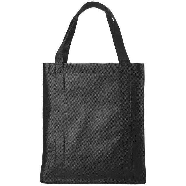 Non woven draagtas met open hoofdvak met extra kartonnen bodem. Draag hoogte 25,4 cm. Tas is geschikt voor recycling.