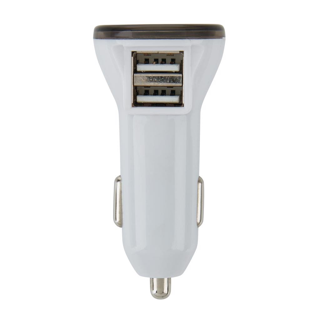 Auto USB oplader met dubbele USB poort en LED verlichting op de top. Output: 5V/2.1A.
