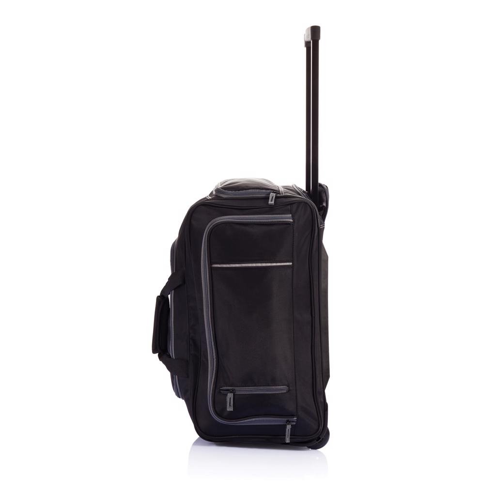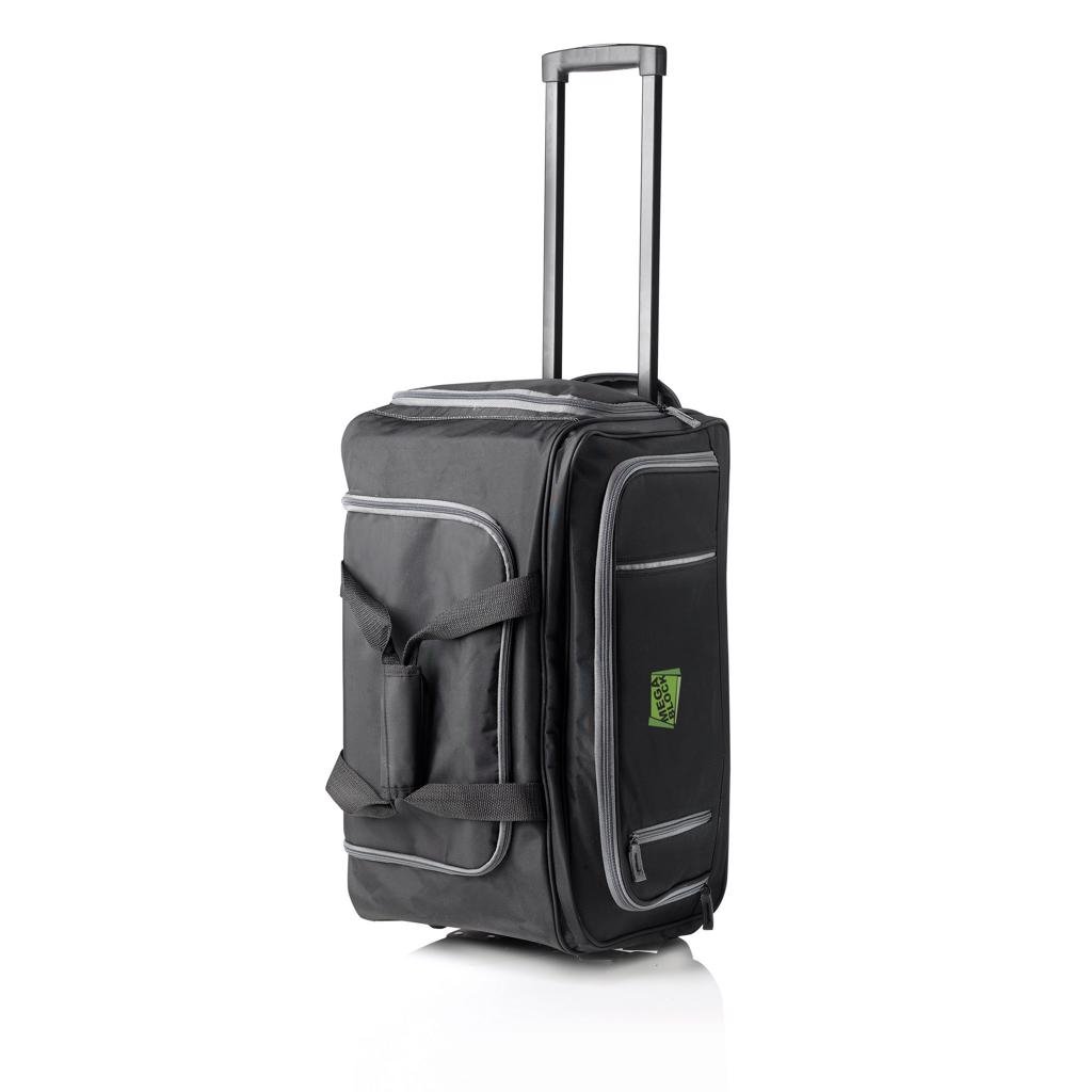 Gevoerd microfiber met grijs suèdine detail, 4 compartimenten, extra grote hoofdcompartiment en separaat trolley compartiment. Capaciteit ca. 40L. Geregistreerd ontwerp®.