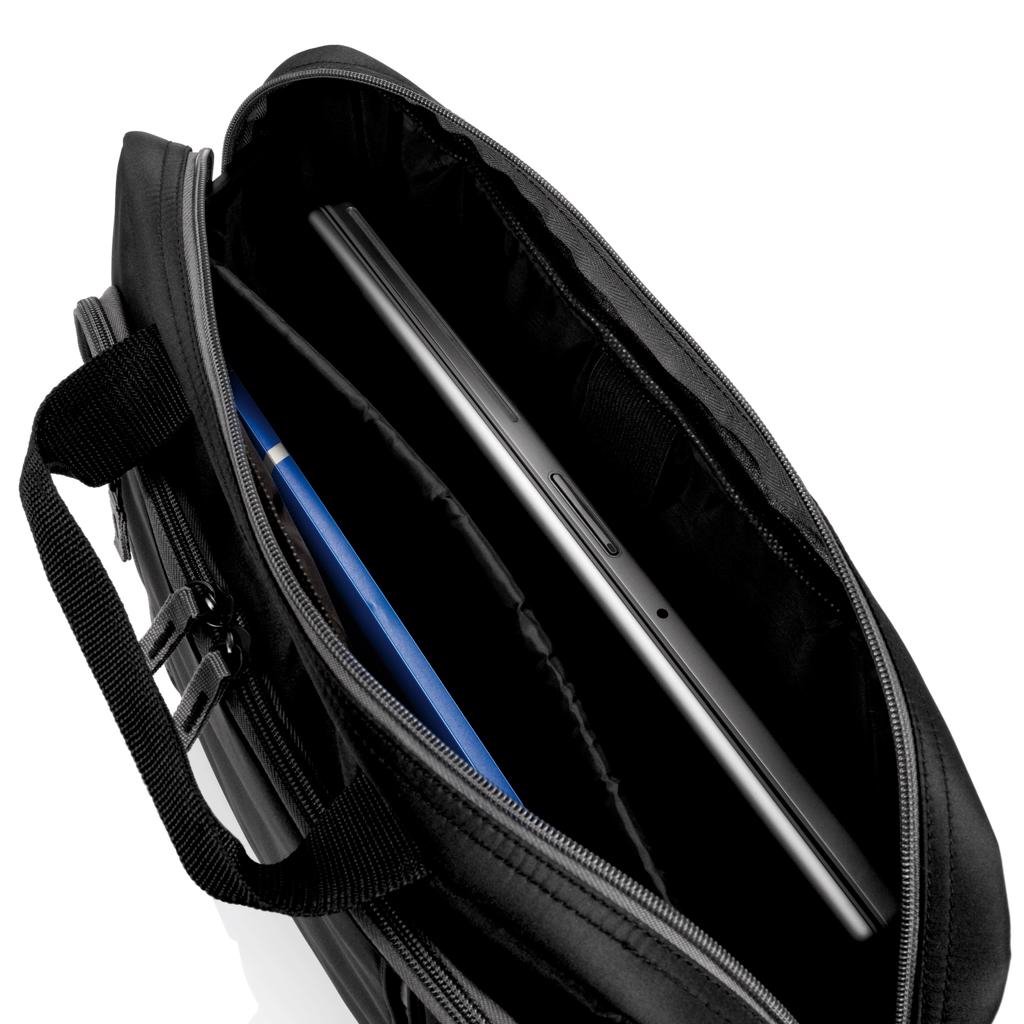 Gevoerd microfiber met grijs suèdine detail, grijze ritsen en voorzien van zwarte foam voering, 2 voorvakken en een hoofdcompartiment met opbergvak voor 15,6" laptop, inclusief gevoerde draagriem. Geregistreerd ontwerp®.