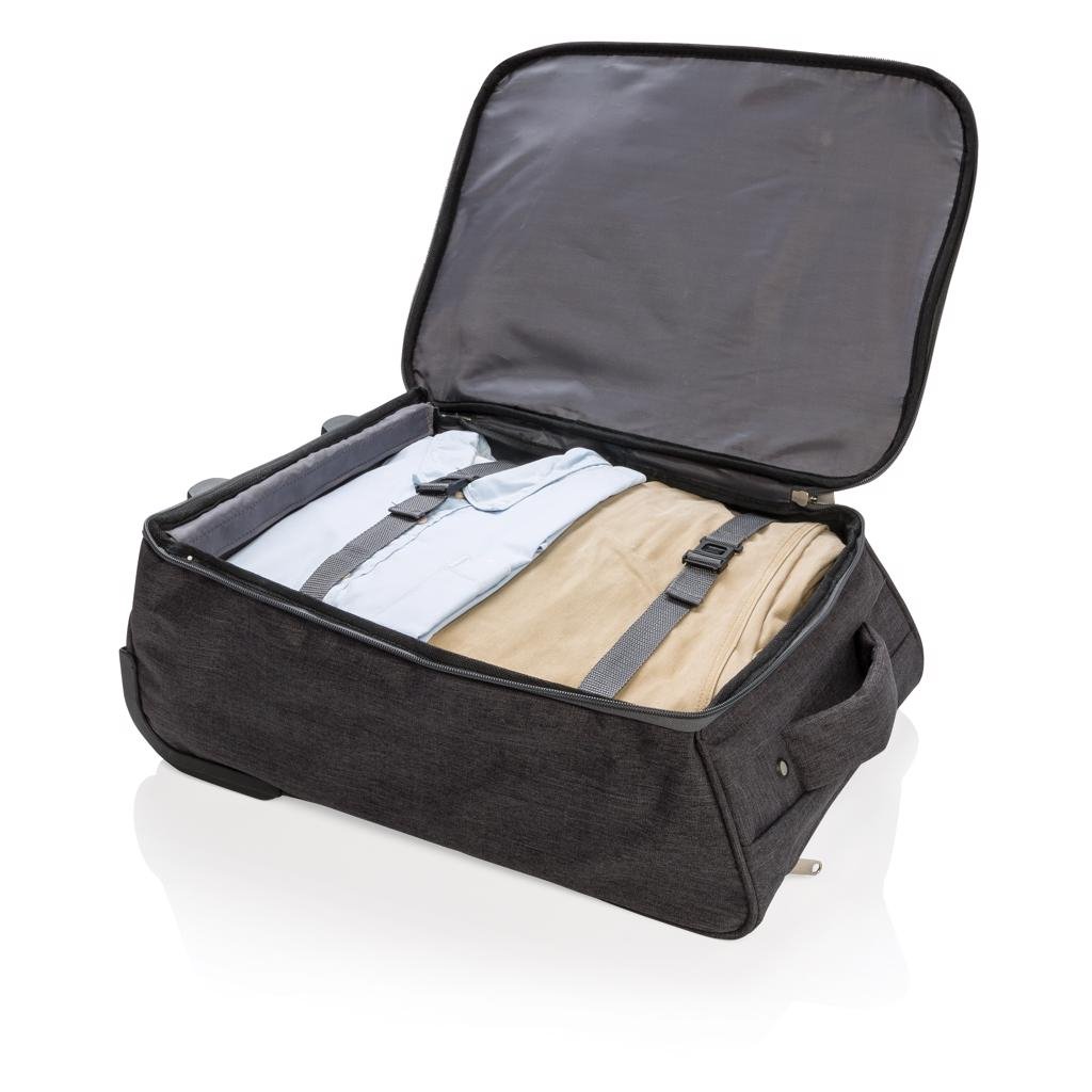Eenvoudig opvouwbare 600D duo tone polyester trolley met 2 wielen, groot hoofdvak en voorvak met rits. Snel en gemakkelijk op te vouwen/ontvouwen en op te bergen thuis. Inhoud: 40L.