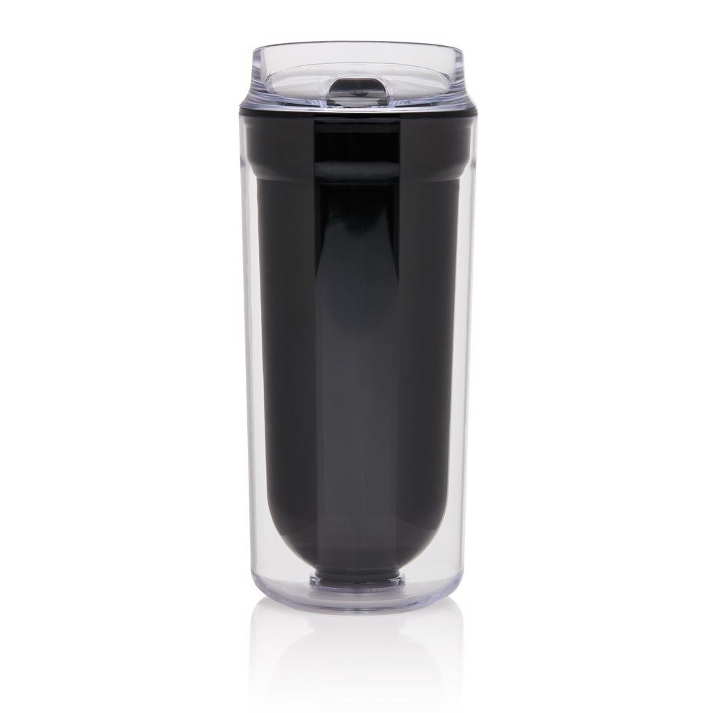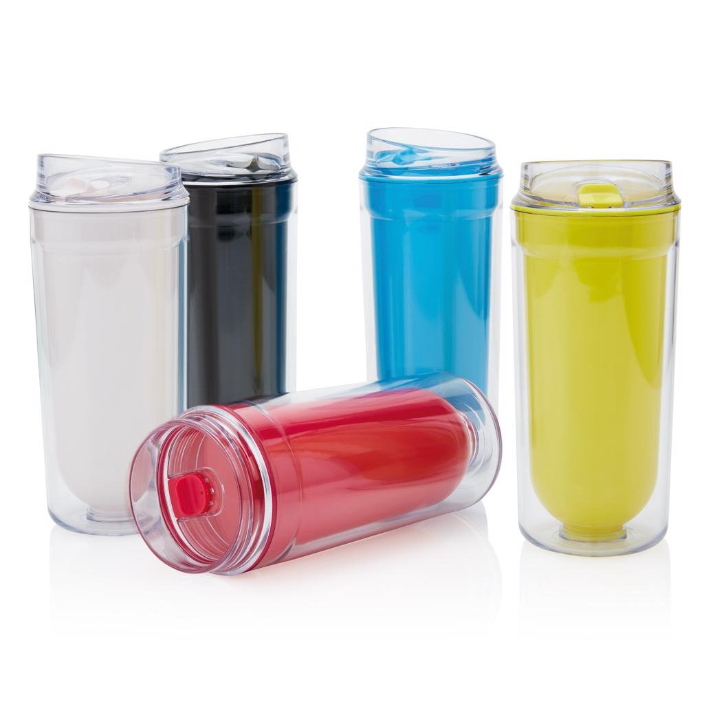 400ml dubbelwandige drinkbeker met transparante AS body voor het drinken van warme of koude dranken. De deksel is gemakkelijk te sluiten en te openen.
