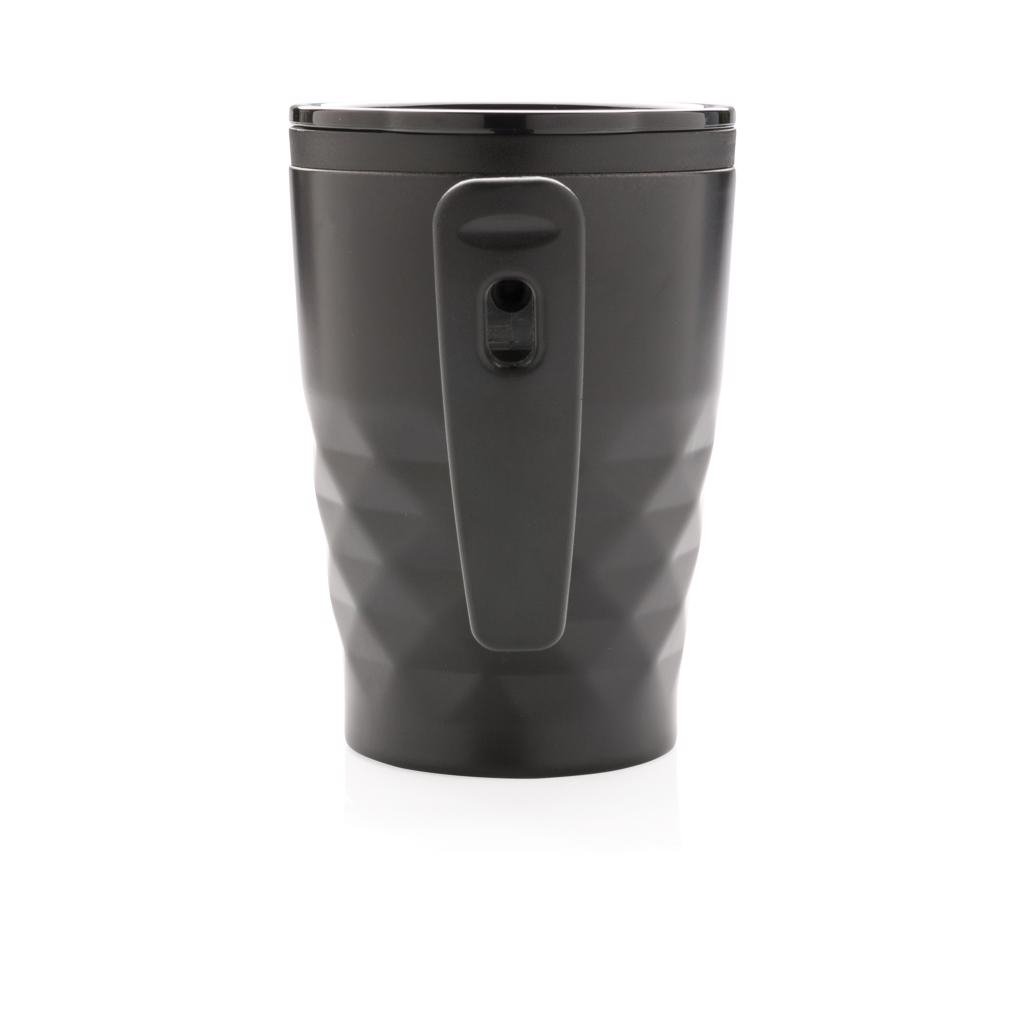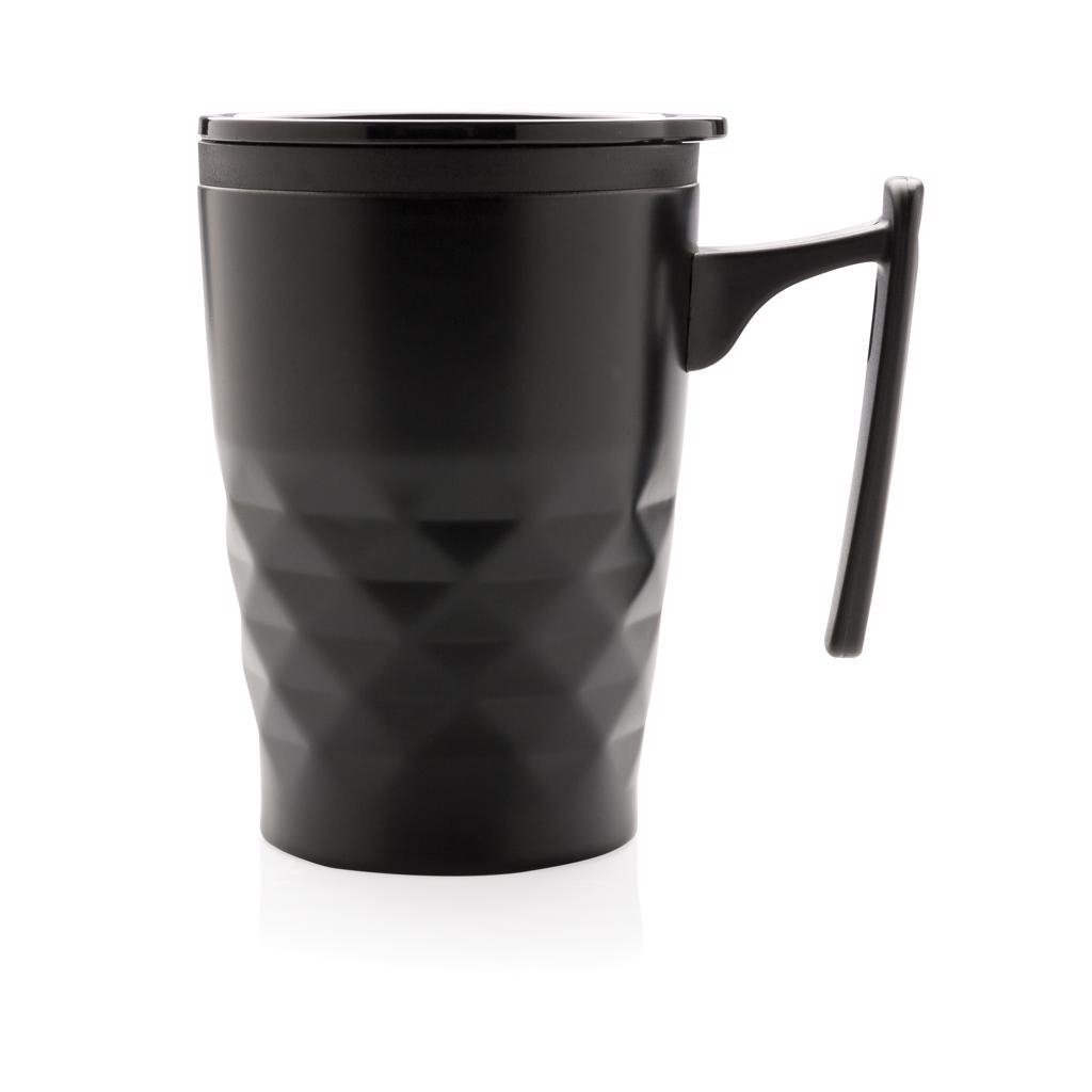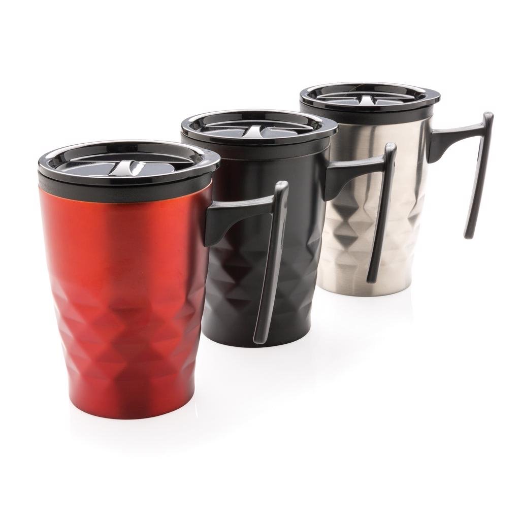Trendy roestvrijstalen drinkbeker met handvat. Past eenvoudig onder de meeste koffiemachines. PP handvat en binnenzijde. Capaciteit 380ml.