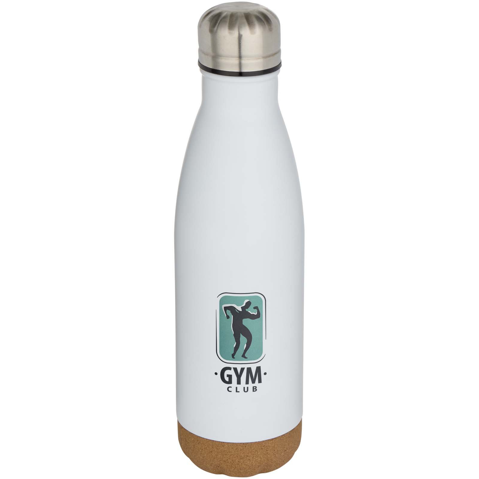 Vacuümgeïsoleerde roestvrijstalen drinkfles met kurken details aan de onderzijde. De dubbelwandige isolatie houdt dranken 12 uur warm en 48 uur koud. Geleverd in een geschenkverpakking van gerecycled karton. Inhoud: 500 ml.