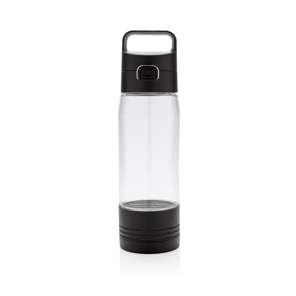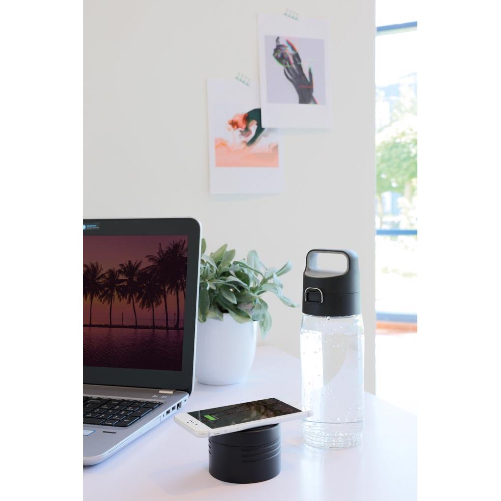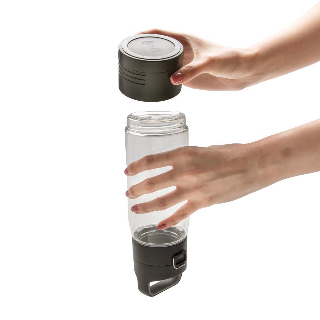 Lekvrije tritan fles met slot en handvat. Inhoud: 600 ml. Inclusief 5.000 mAh draadloze powerbank in de bodem. Compatibel met alle QI-apparaten zoals nieuwste generatie Android, iPhone 8 en hoger. Input: 5.0V/1.0A. Output: 5.0V/2.1A. Draadloze output: 5W. Geregistreerd ontwerp®.