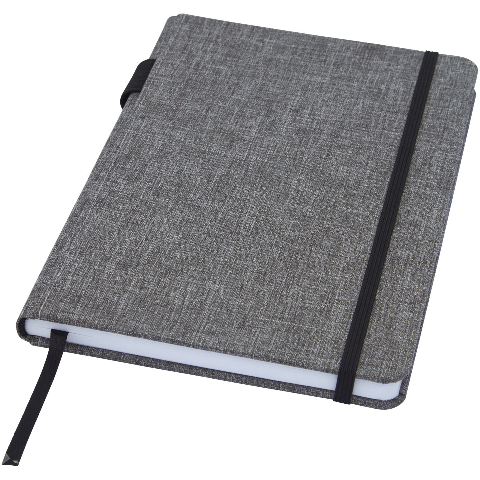 Notitieboek in A5-formaat met cover gemaakt van RPET-stof. Bevat 96 vellen, 70 g/m² gerecycled papier met gelijnde lay-out, een penlus en lint. Verpakt in een kartonnen hoes.