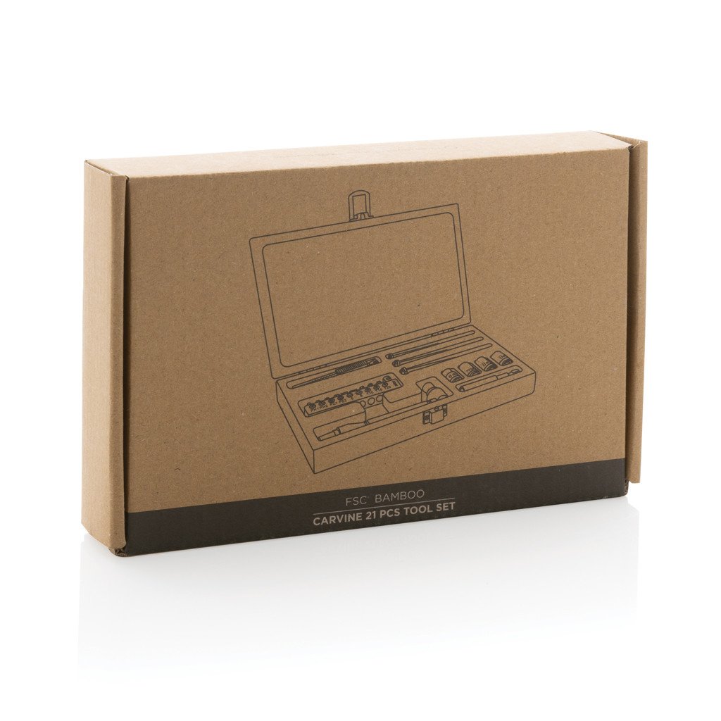 Gereedschapsset met 21 stuks in een luxe FSC® 100% bamboe behuizing. De set bevat 3 schroevendraaiers, 10 bits in houder, 4 sockets, 1 handvat, 1 connector, 1 kleine snijder. Verpakt in FSC® mix kraft verpakking.