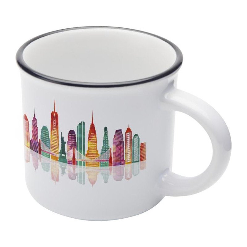 Keramische mok met vintage design voor je favoriete koffie of thee om de dag mee te beginnen. Speciale coating aan de buitenkant die sublimatiebedrukking mogelijk maakt. Vaatwasserbestendig. Gepresenteerd in een gerecyclede kartonnen geschenkverpakking. Inhoud: 240 ml.