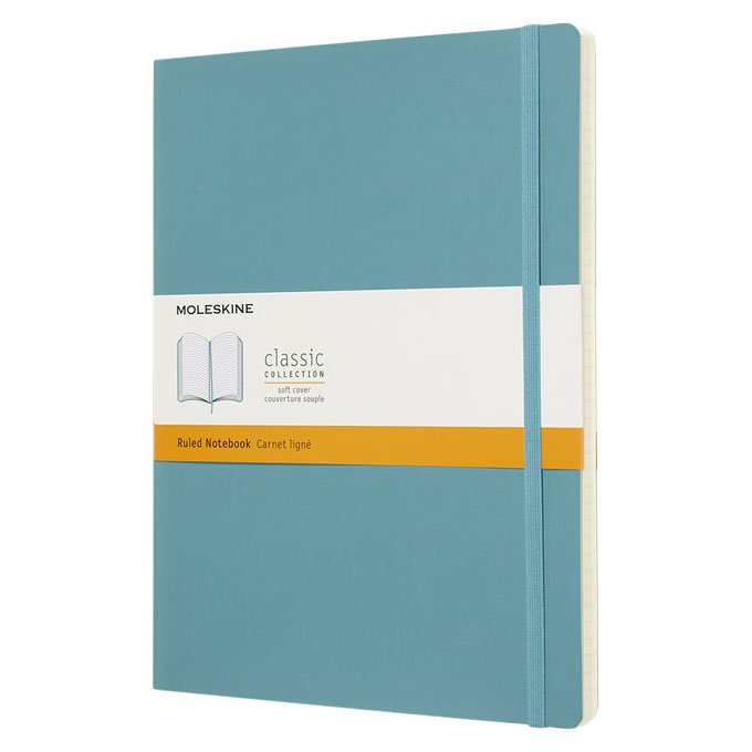 De Moleskine Classic XL (19x25cm) soft cover notebook heeft een kartonnen zachte kaft met afgeronde hoeken, zuurvrij papier, een bladwijzer, een elastieken sluiting en de karakteristieke 'In case of loss' print op het titelblad. De envelop achterin het notitieboekje is geschikt voor losse notities en bevat een foldertje met de unieke geschiedenis van Moleskine. Bevat 192 ivoorkleurige gelinieerde pagina's.