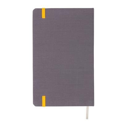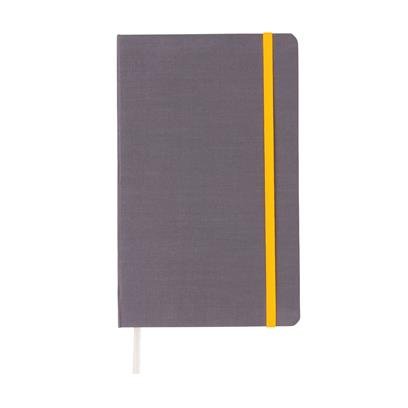 Modieus gelinieerd A5 hardcover met stof beklede notitieboek. Gekleurde zijde matcht met elastieken band sluiting. 240 pagina's van 80g/m². Crèmekleurige pagina's.
