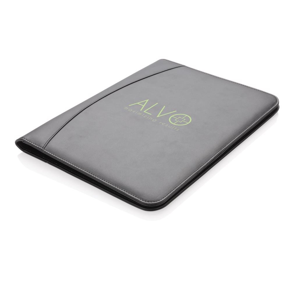 A4 PU tech portfolio. binnenkant: een telefoon/tablet standaard, telefoonhouder met see-through window waarmee je jouw mobiele apparaat kunt bedienen. Geschikt voor iPhone 6 & Samsung S6 etc. Gadget vakjes voor bijvoorbeeld usb stick, oplaadkabel & powerbank. 5 kaarthouders en één ID houder. Inclusief 1 A4 notitieblok met 20 vellen. Compatibel met alle iPad, Android en Microsoft Windows tablets.