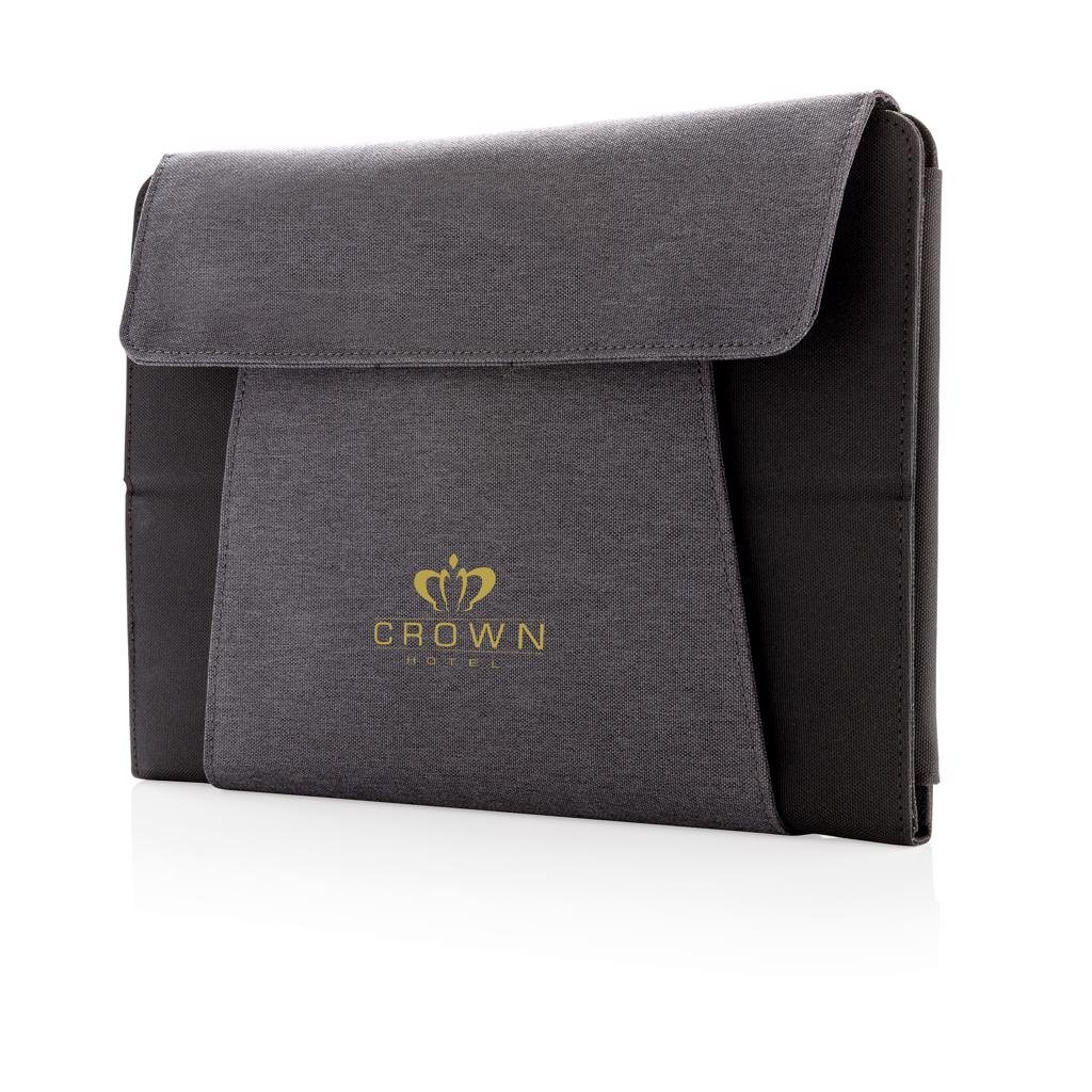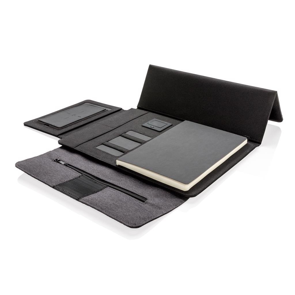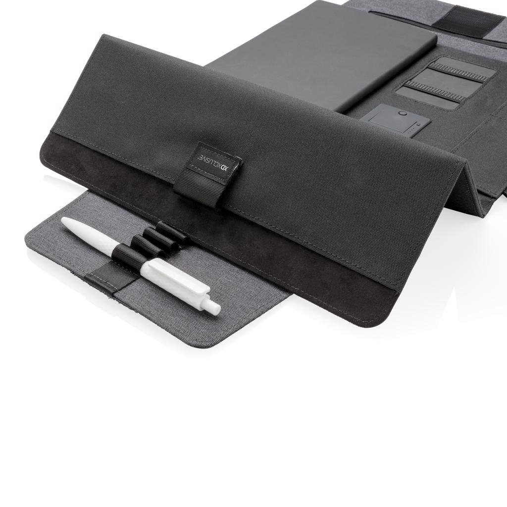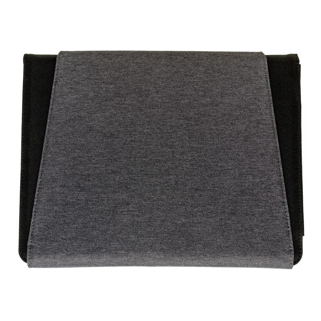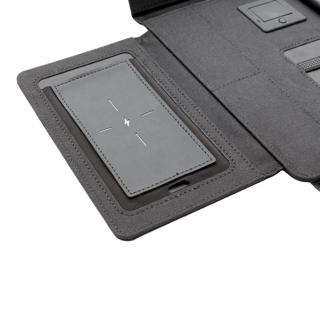 Open de Kyoto schrijfmap en je zult zien dat er een heel kantoor in past, inclusief je 10" tablet (die je ook rechtop kunt zetten). Inclusief 4.000 mAh draadloze powerbank. Compatibel met alle QI-apparaten zoals Android nieuwste generatie, iPhone 8 en hoger. Input: 5.0V/1.0A. Output: 5.0V/2.1A. Draadloze output: 5W. Gemaakt van rPET (gerecycleerde PET-flessen). Inclusief uitneembaar notitieboek met 128 crèmekleurige pagina's van 80 g/m². Geregistreerd ontwerp®.