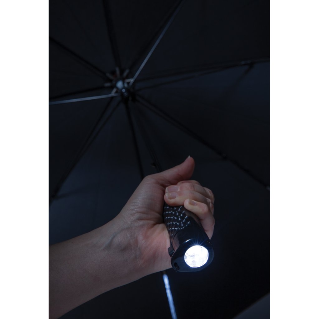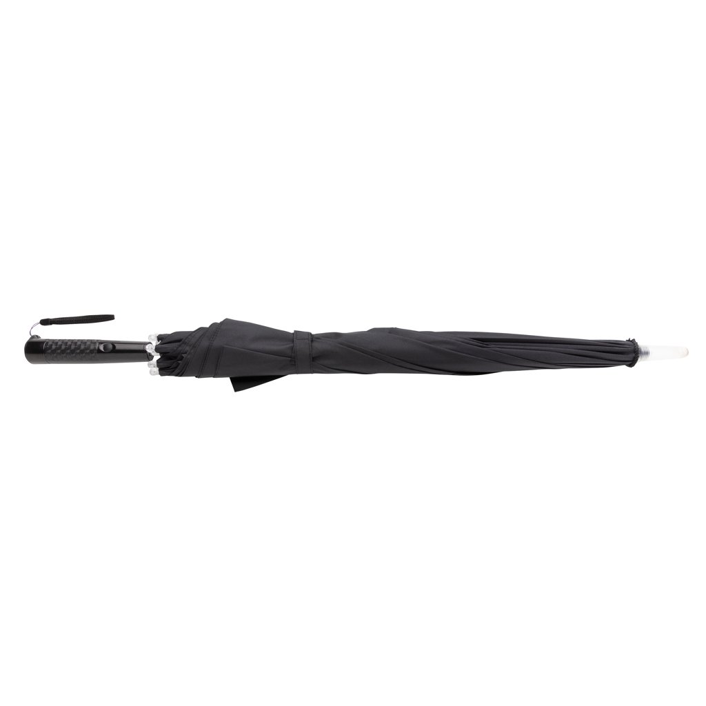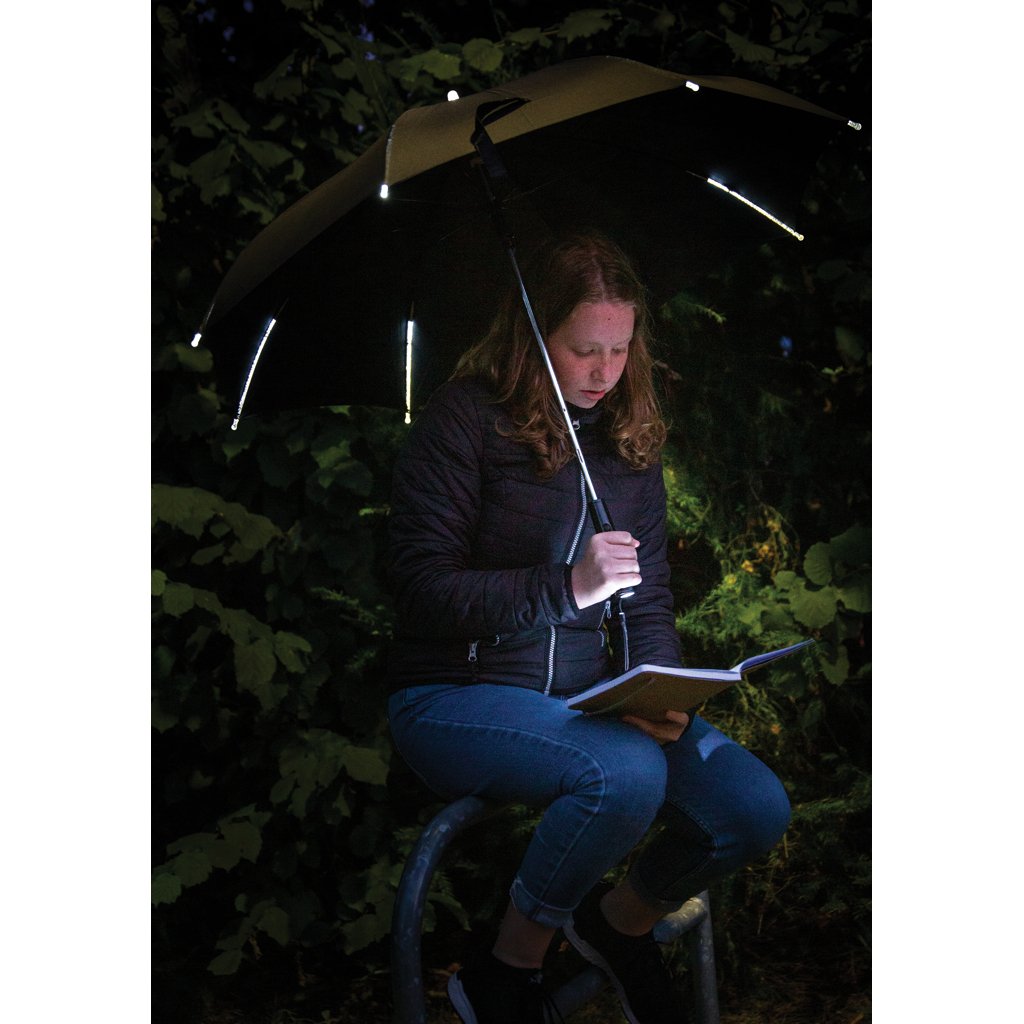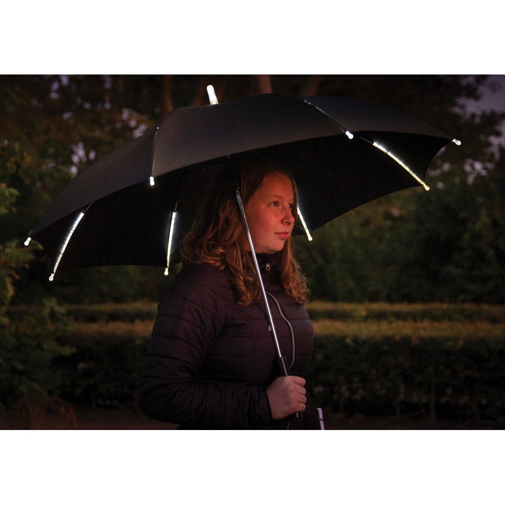 Deze manueel open/dicht paraplu met LED verlichting maakt wandelen in de regen leuk! De paraplu heeft 8 witte LED-lampjes op elke rib. Naast een mooi lichteffect, ben je ook goed zichtbaar en kan je 's avonds veilig wandelen. In het handvat vind je een praktisch lampje. De paraplu is gemaakt van 190T pongee polyester en heeft een frame van fiberglas en baleinen, waardoor hij stormbestendig is. Inclusief 3 AAA-alkalinebatterijen.