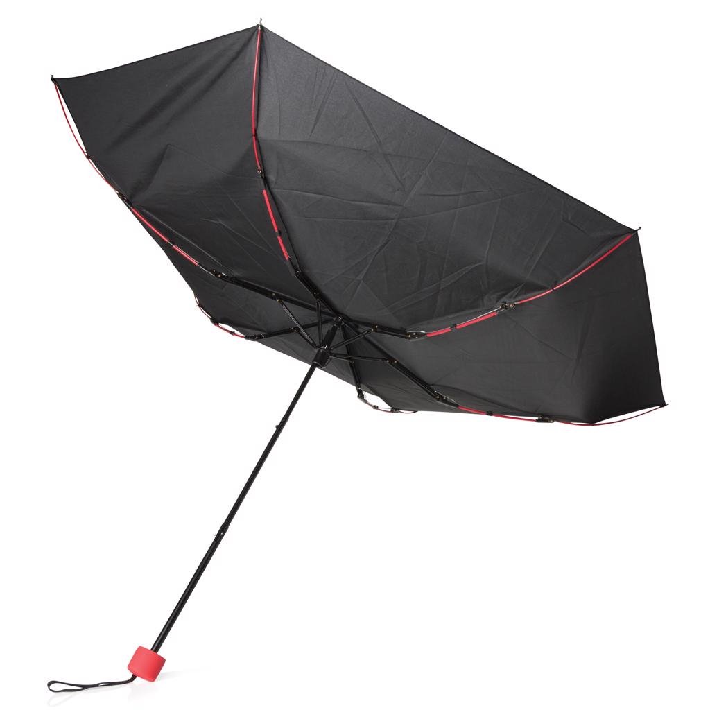 190T pongee opvouwbare paraplu met 6 panelen en handmatige opening. Metalen steel & frame in zwarte kleur. Bijpassende gekleurde glasvezel baleinen, handvat en etui.