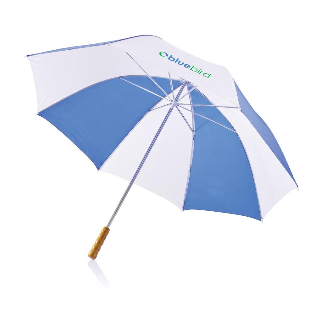 Paraplu met 210T polyester bespanning. Metalen steel en punt, dubbele metalen baleinen, PP doppen en recht houten handvat.