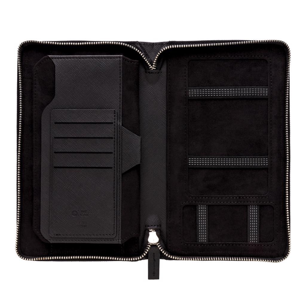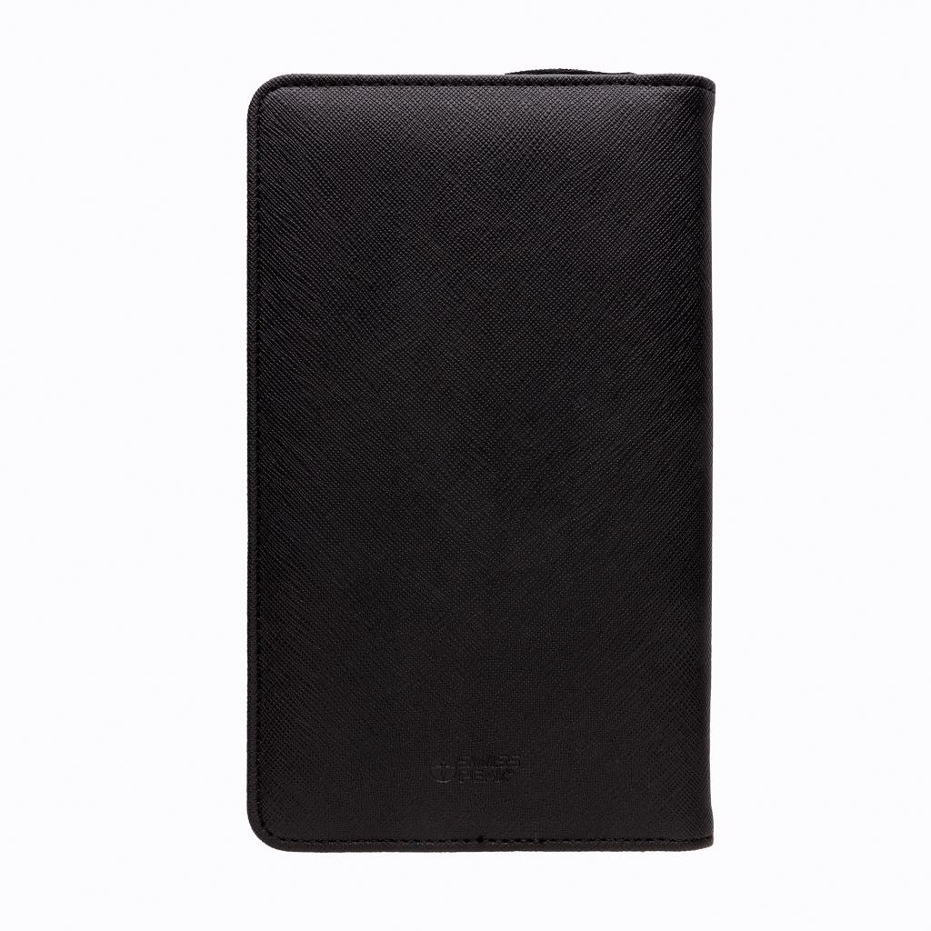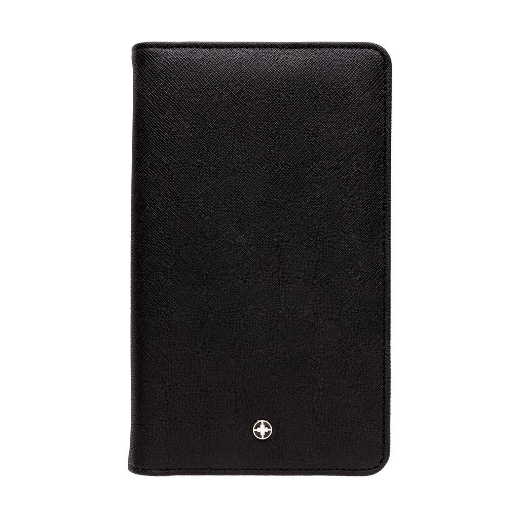 Luxe reisportefeuille met RFID-bescherming bewaart al je reisdocumenten zoals paspoort, tickets en geld veilig. Met 4 sleeves voor kaarten en pennenlus. De rechterkant kan je smartphone vasthouden.