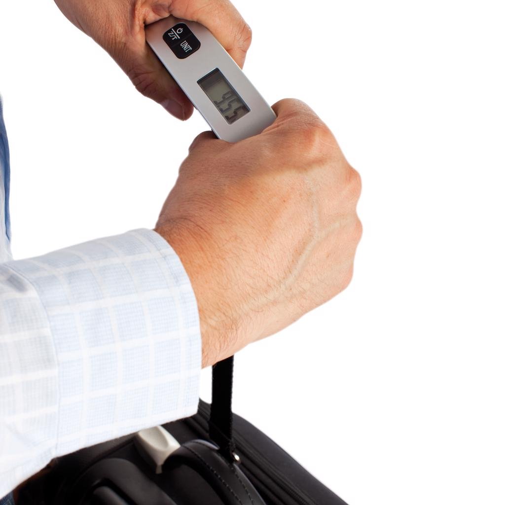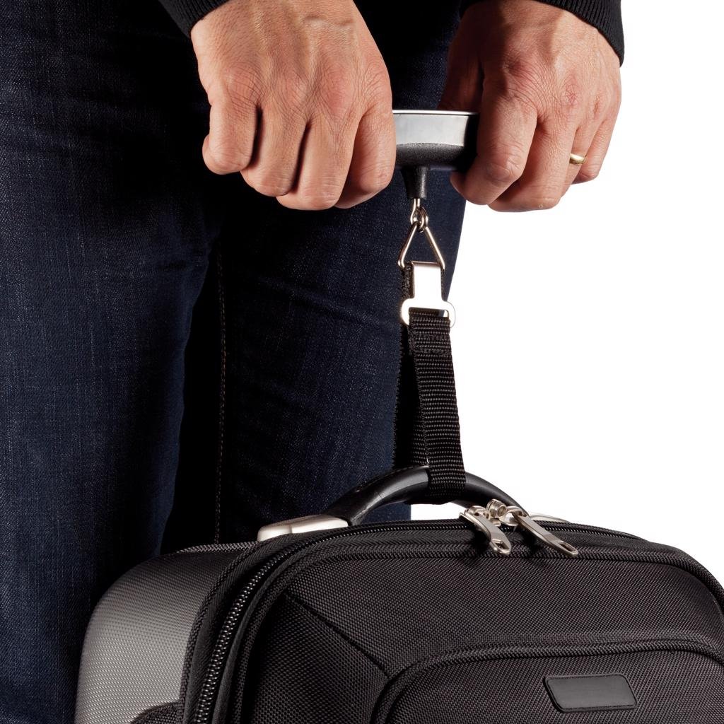 Elektronische bagageweger, maximum gewicht 50kg, gaat per 50gr. Nul en tarra functie, weergave van de ruimtetemperatuur, lege batterij en overgewicht indicator.