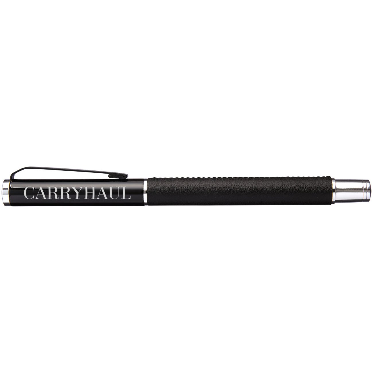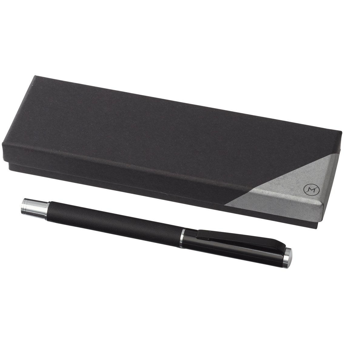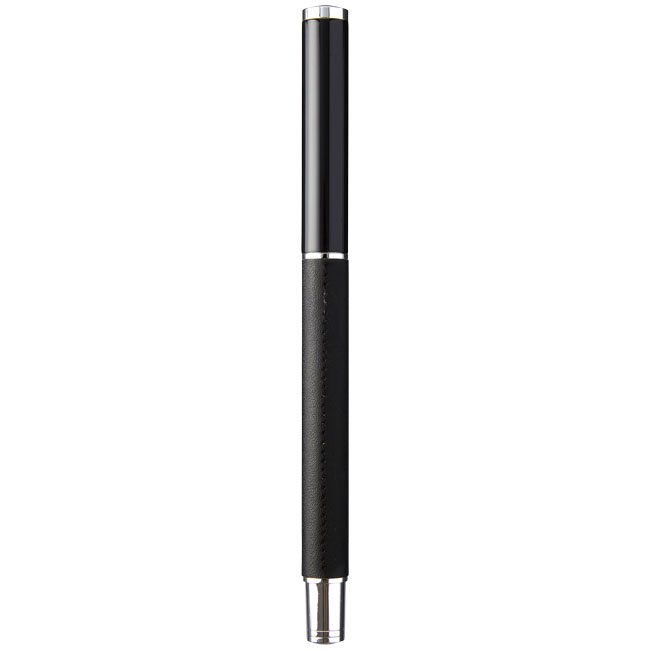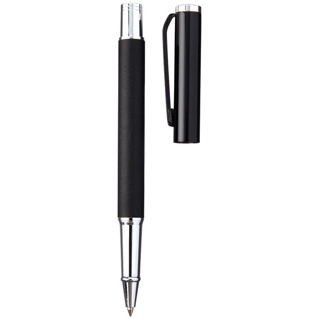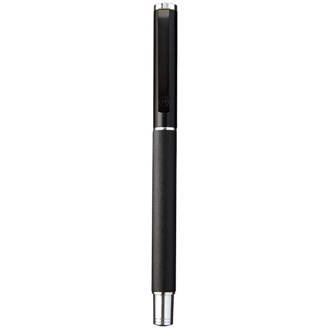 Exclusief design rollerball pen. PU lederen wikkel met mat zwarte bovenzijde en Chrome accenten. Pen bevat premium zwarte roller ball vulling. Verpakt in een 2-delig Marksman® geschenkverpakking.
