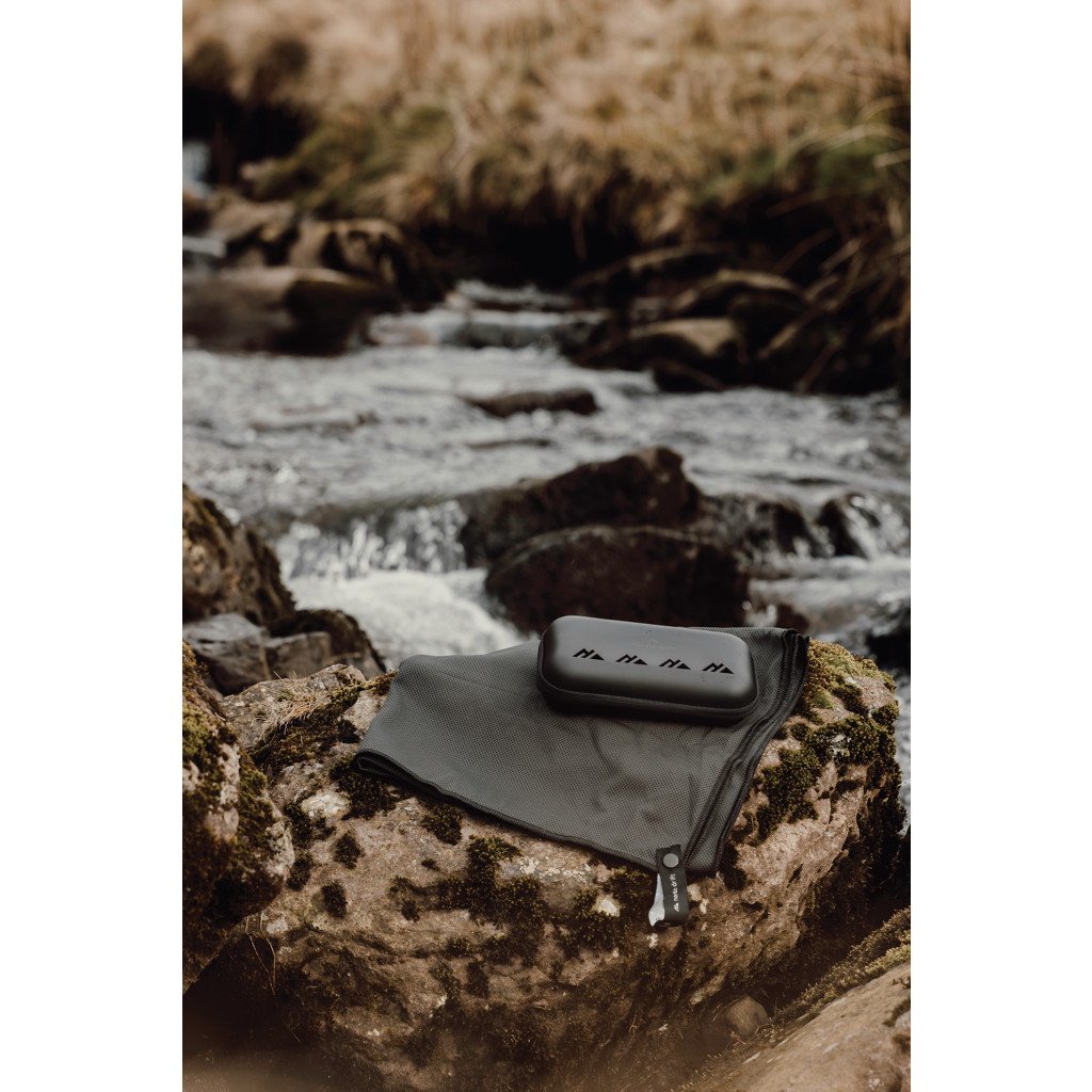 Neem deze active handdoek mee op elk avontuur. Gemaakt van 54% gecertificeerd gerecycled polyester (GRS) en ontworpen als ademende metgezel die snel vocht opneemt en transpiratie en irritatie vermindert. Handig verpakt in een reisvriendelijke pouch met karabijnhaak om eenvoudig aan je tas te bevestigen. Met een formaat van 70×140 cm, een ophanglus en een lichtgewicht, zachte stof is de handdoek comfortabel en praktisch in gebruik.