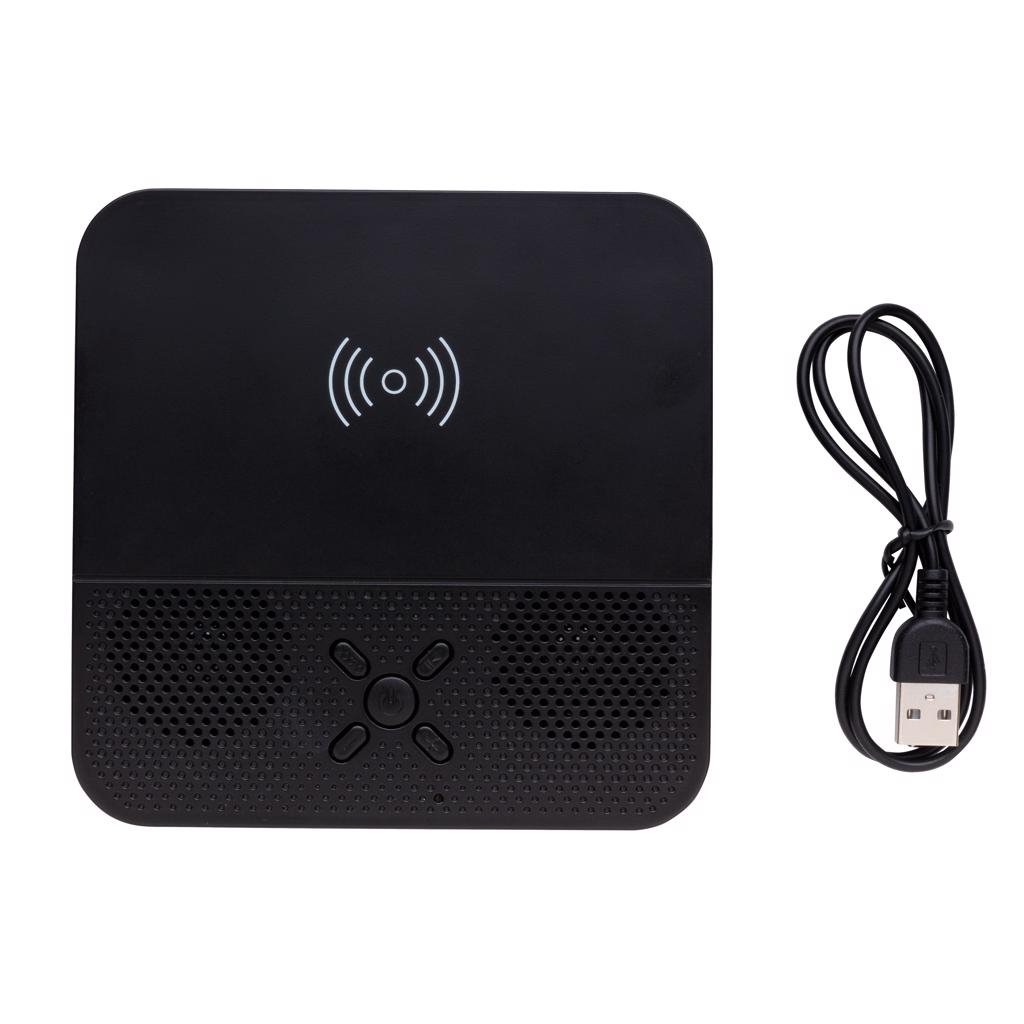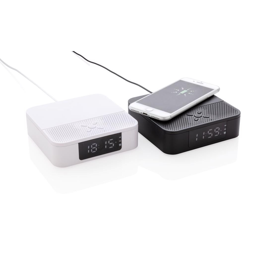 Moderne draadloze luidspreker met geïntegreerd draadloos oplaadstation en wekkerfunctie. De draadloze luidspreker heeft 2x3W-luidsprekers voor een geweldig geluid. Met een geïntegreerde 2.000 mAh-batterij die je telefoon kan opladen via de draadloze oplader. Perfect om je telefoon 's nachts op te laden zonder kabels te gebruiken. De luidspreker heeft een geïntegreerde wekker en ondersteunt handsfree bellen. Werkafstand tot 10 meter voor draadloze muziek. Muziek speeltijd tot 6 uur. Werkt op batterijen of op een USB-poort. ABS materiaal. Draadloos opladen compatibel met Android nieuwste generaties, iPhone 8 en hoger. Ingang: 5V 1A. Draadloze uitgang: uitgang: 5V/1A 5W. Inclusief micro usb-kabel van 150cm.
