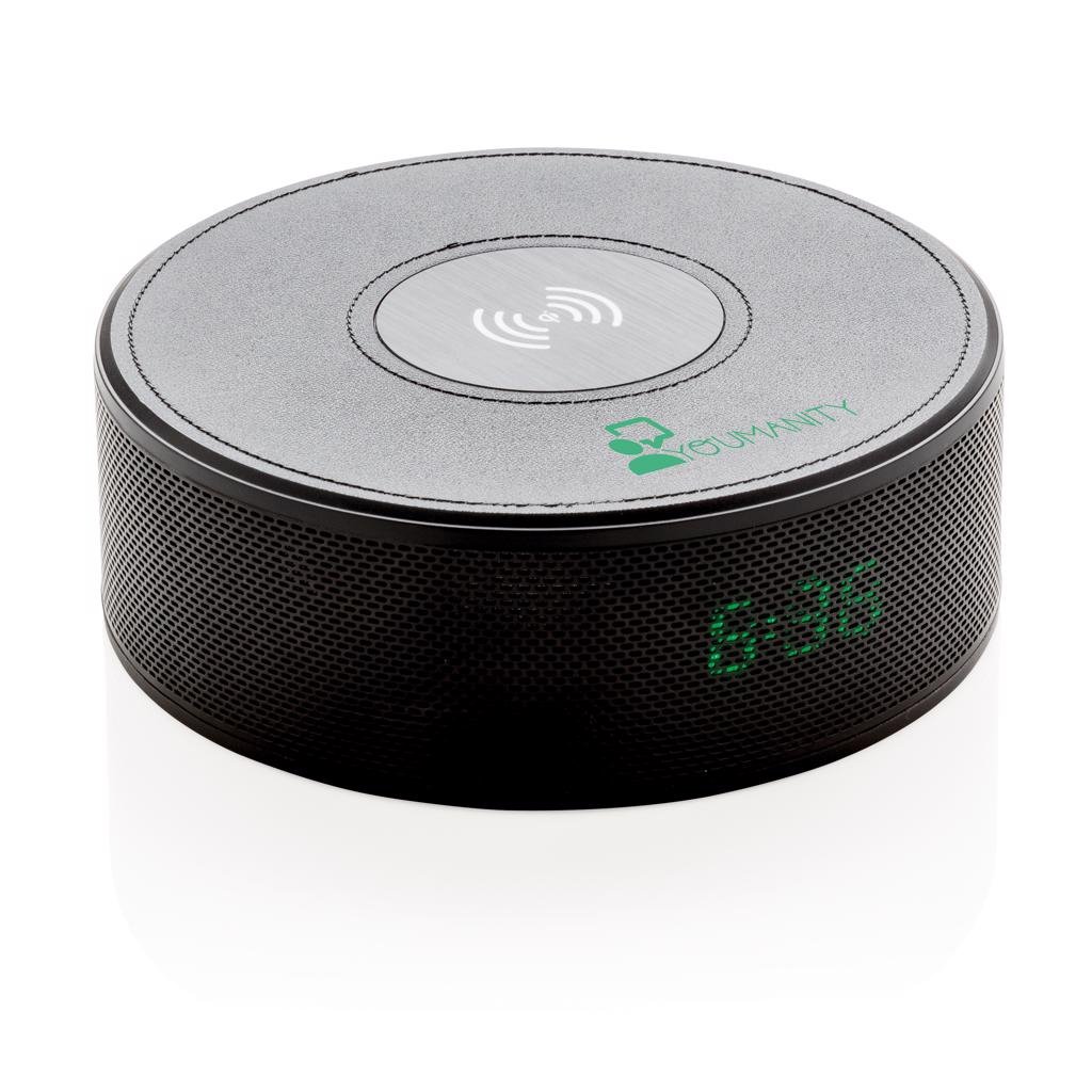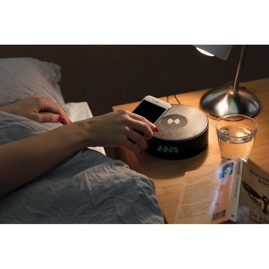Unieke draadloze luidspreker met geintegreerde oplaadstation en alarmklok functie. Deze draadloze speaker heeft een 2x3 watt vermogen en produceert een te gek geluid. Met de 4000mAh geintegreerde batterij kan je je telefoon draadloos opladen. Perfect om je telefoon ?s nachts op te laden zonder kabels te gebruiken. De speaker is ook voorzien van een FM radio, alarmklok en handsfree bellen. Het bereik is maximaal 10 meter voor draadloos muziek luisteren. Speeltijd tot maximaal 8 uur. De speaker kan zowel draadloos worden gebruikt of verbonden via een USB poort. Materiaal in ABS. Draadloos opladen compatibel met alle QI-apparaten zoals Android nieuwste generatie, iPhone 8 en hoger. Input: 5V/ 2A. Draadloze output: 5V/1A; 5W.
