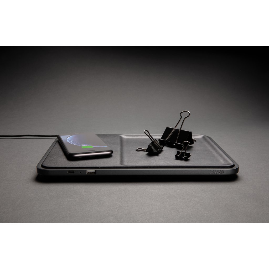 Stijlvolle 5W draadloze oplader met desk organizer gemaakt van hoogwaardig PU en ABS. Plaats gewoon je telefoon op de PU-pad om je telefoon op te laden. De desk organizer kan worden gebruikt om je bureau georganiseerd te houden. De draadloze oplader heeft een USB- en type C-uitgang om je apparaat via de kabel op te laden. Input 5V/2A Draadloze output: 5V/1A. USB-uitgang/type C-uitgang: 5V/1A. Draadloos opladen compatibel met alle QI-apparaten zoals de nieuwste generatie Android. iPhone 8 en hoger. Verpakt in luxe geschenkdoos inclusief luxe nylon 150 cm micro USB-laadkabel.