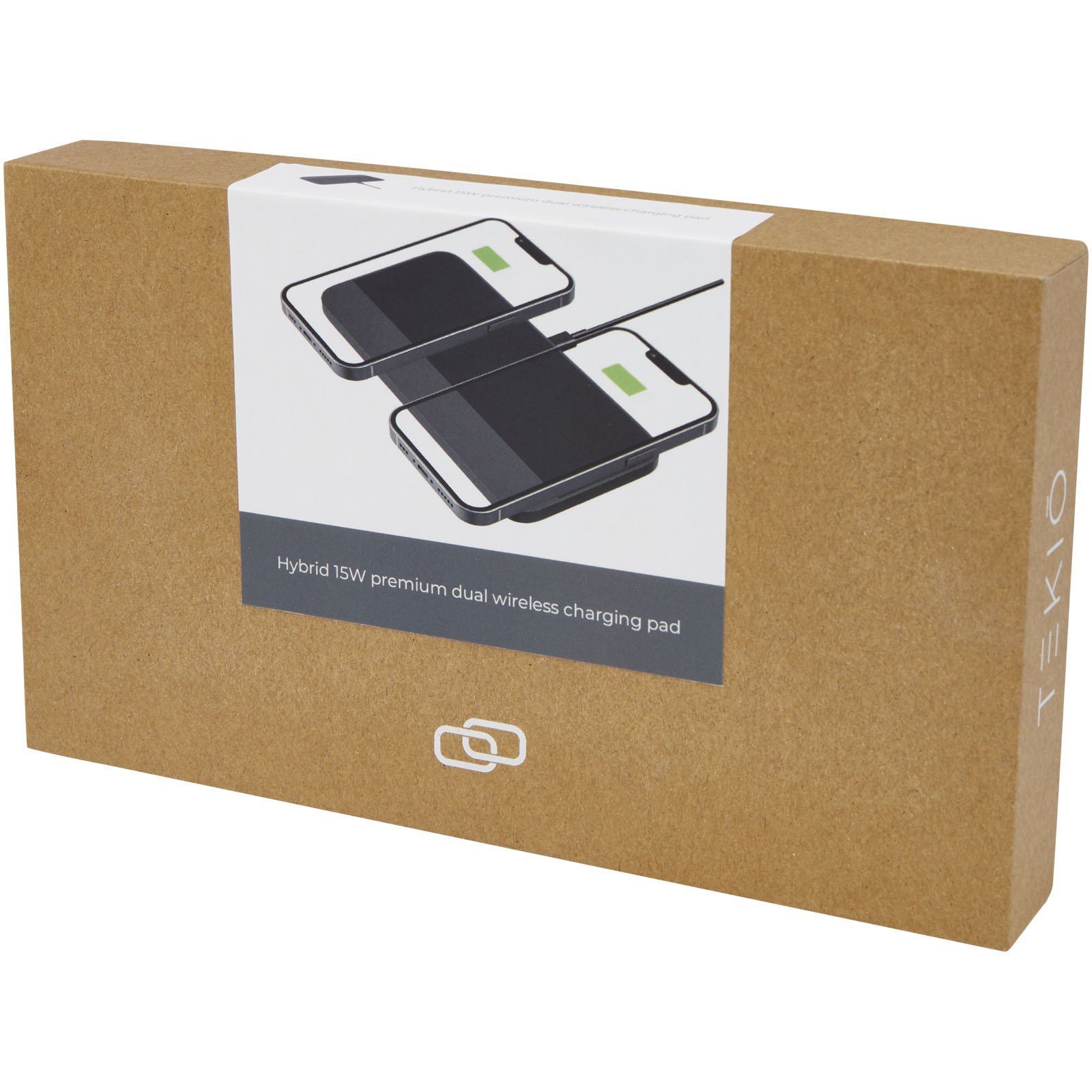 Het Hybrid premium dubbel 15 W draadloos oplaadstation is een aanwinst voor elk kantoor. Hij past gemakkelijk in de vakken van een laptoptas dankzij het ultraslanke ontwerp. Gemaakt van duurzame aluminium behuizing gecombineerd met een antislip TPU leren oplaadstation. Met maximaal 15 W draadloos oplaadvermogen kunnen twee apparaten snel en tegelijkertijd volledig worden opgeladen. Compatibel met alle Qi-apparaten (iPhone 8 of hoger en Android-apparaten die draadloos opladen ondersteunen). Met ingebouwde FOD (Foreign Object Detection) om ongewenste voorwerpen te identificeren en een soepel laadproces te garanderen. Geleverd in een premium doos van kraftpapier met een kleurrijke sticker. Type-C-oplaadkabel is inbegrepen.