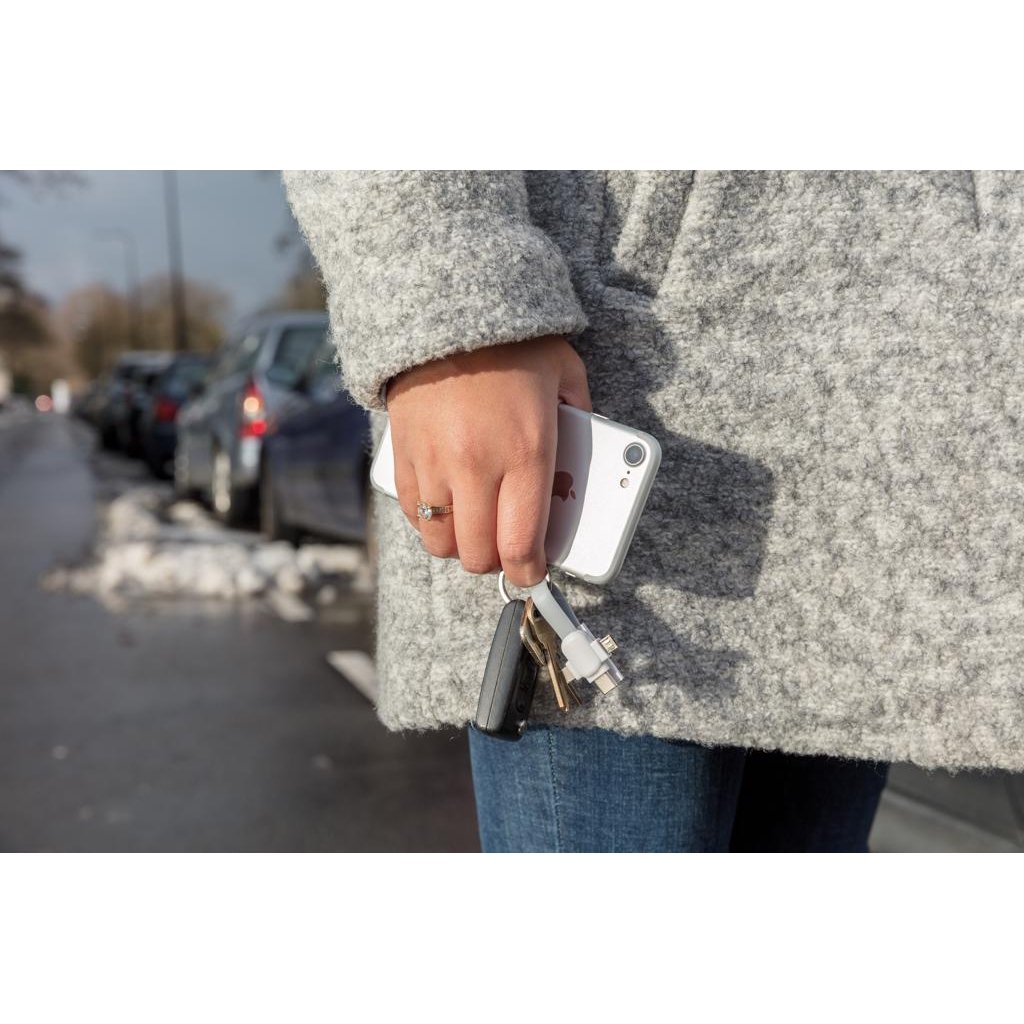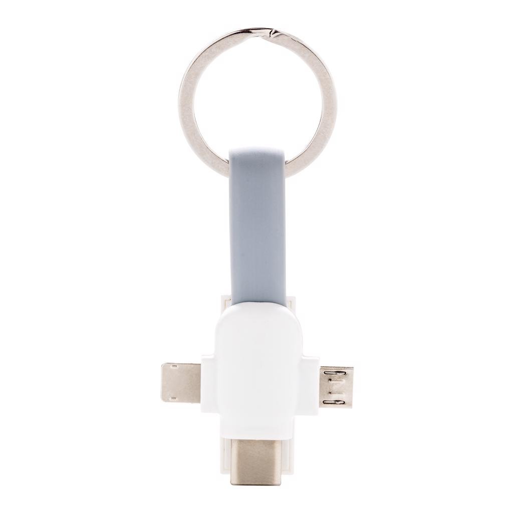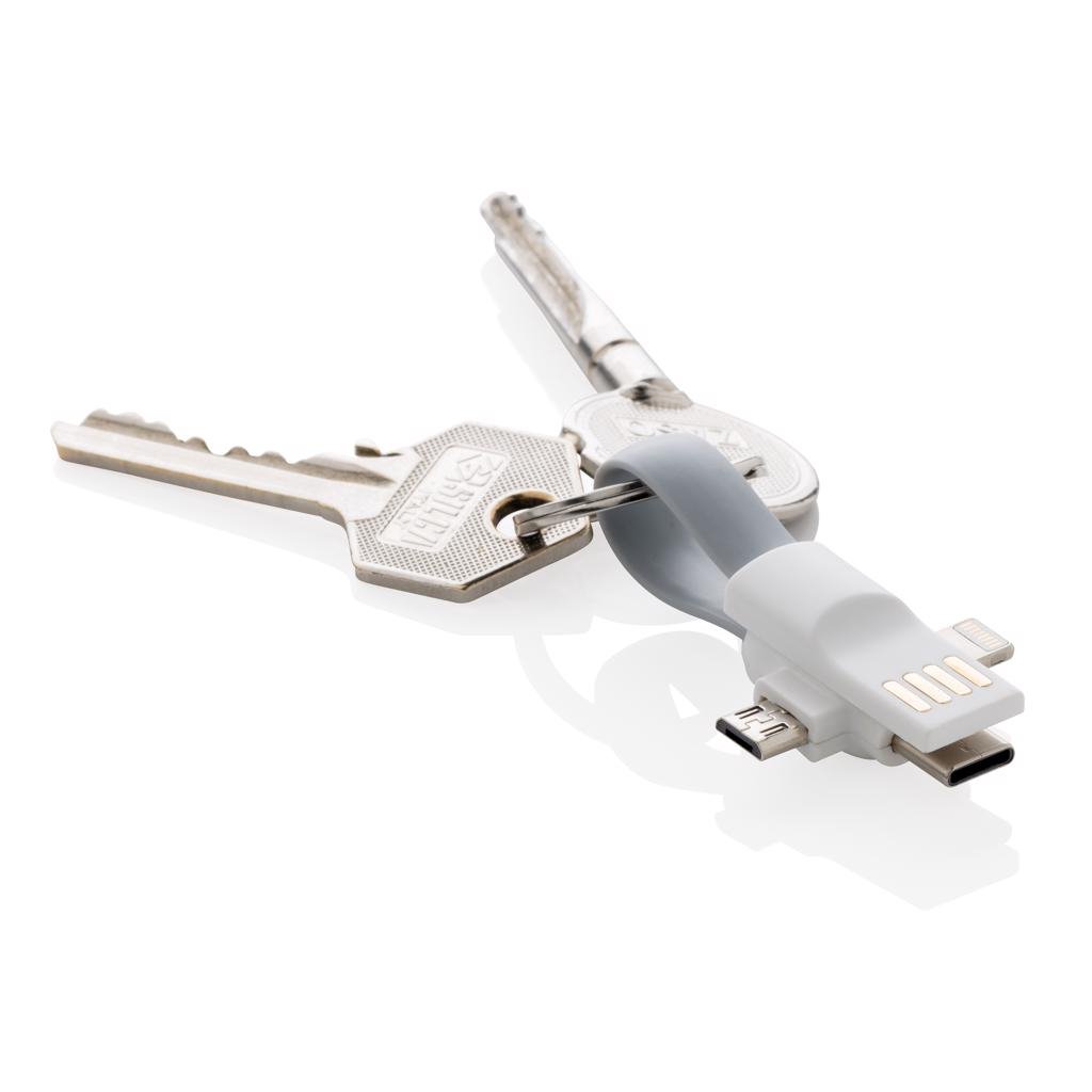 Sleutelhanger-kabel met 3 verschillende connectoren: micro-USB, type C en een dubbelzijdige lightning stekker voor IOS- en Androidapparaten. Geschikt voor het opladen en synchroniseren van gegevens. Beide uiteinden kunnen met een magneet worden verbonden om de kabel compact en gemakkelijk te dragen te houden.