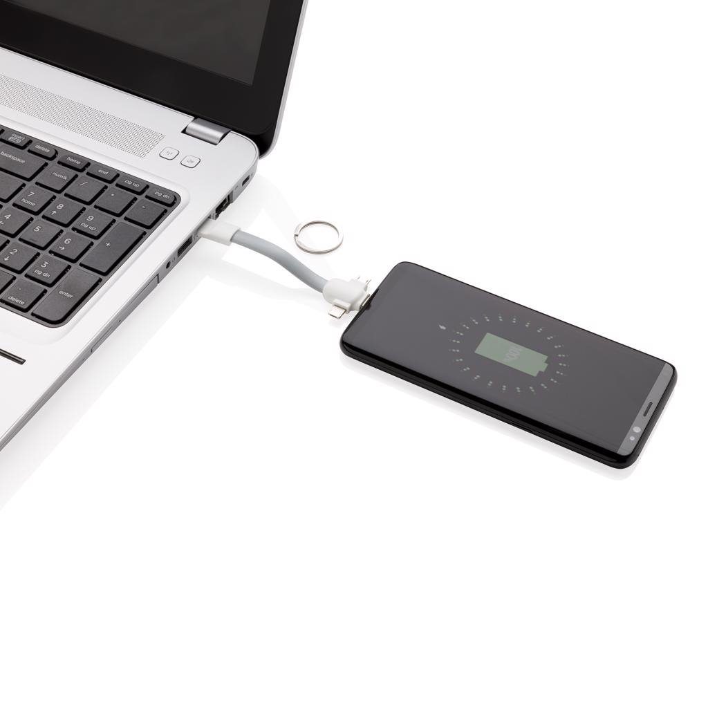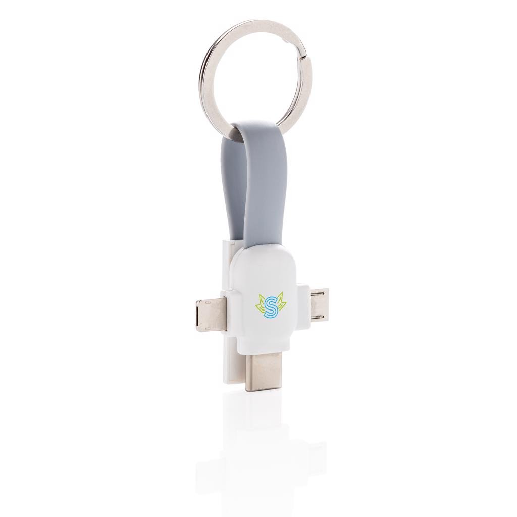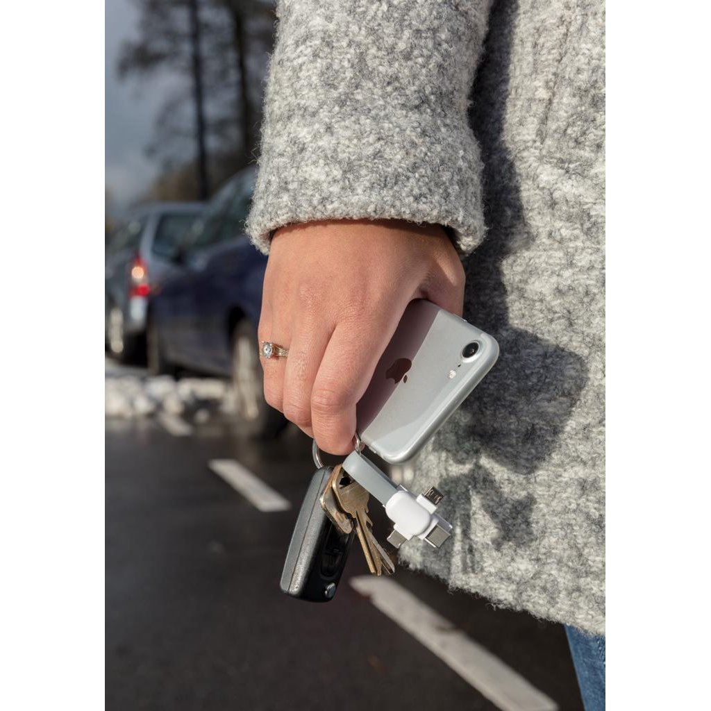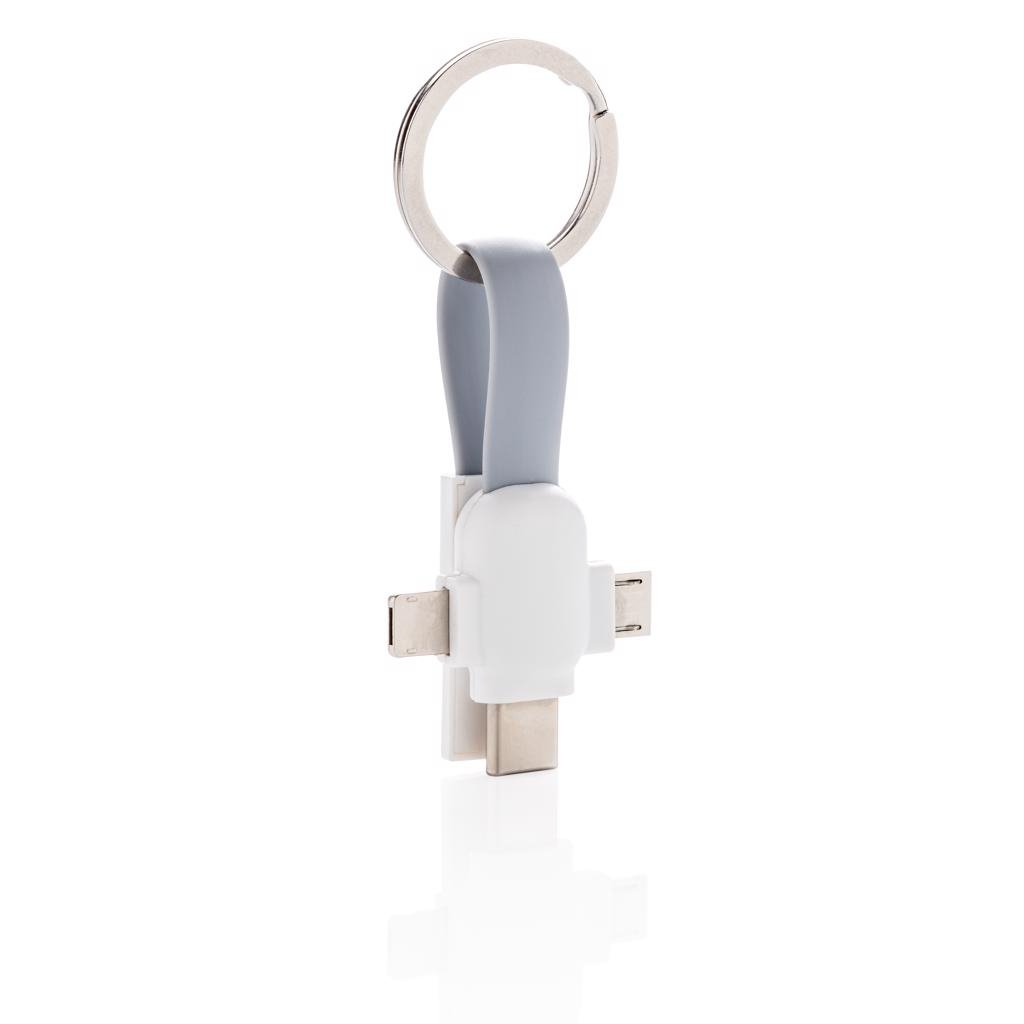 Sleutelhanger-kabel met 3 verschillende connectoren: micro-USB, type C en een dubbelzijdige lightning stekker voor IOS- en Androidapparaten. Geschikt voor het opladen en synchroniseren van gegevens. Beide uiteinden kunnen met een magneet worden verbonden om de kabel compact en gemakkelijk te dragen te houden.